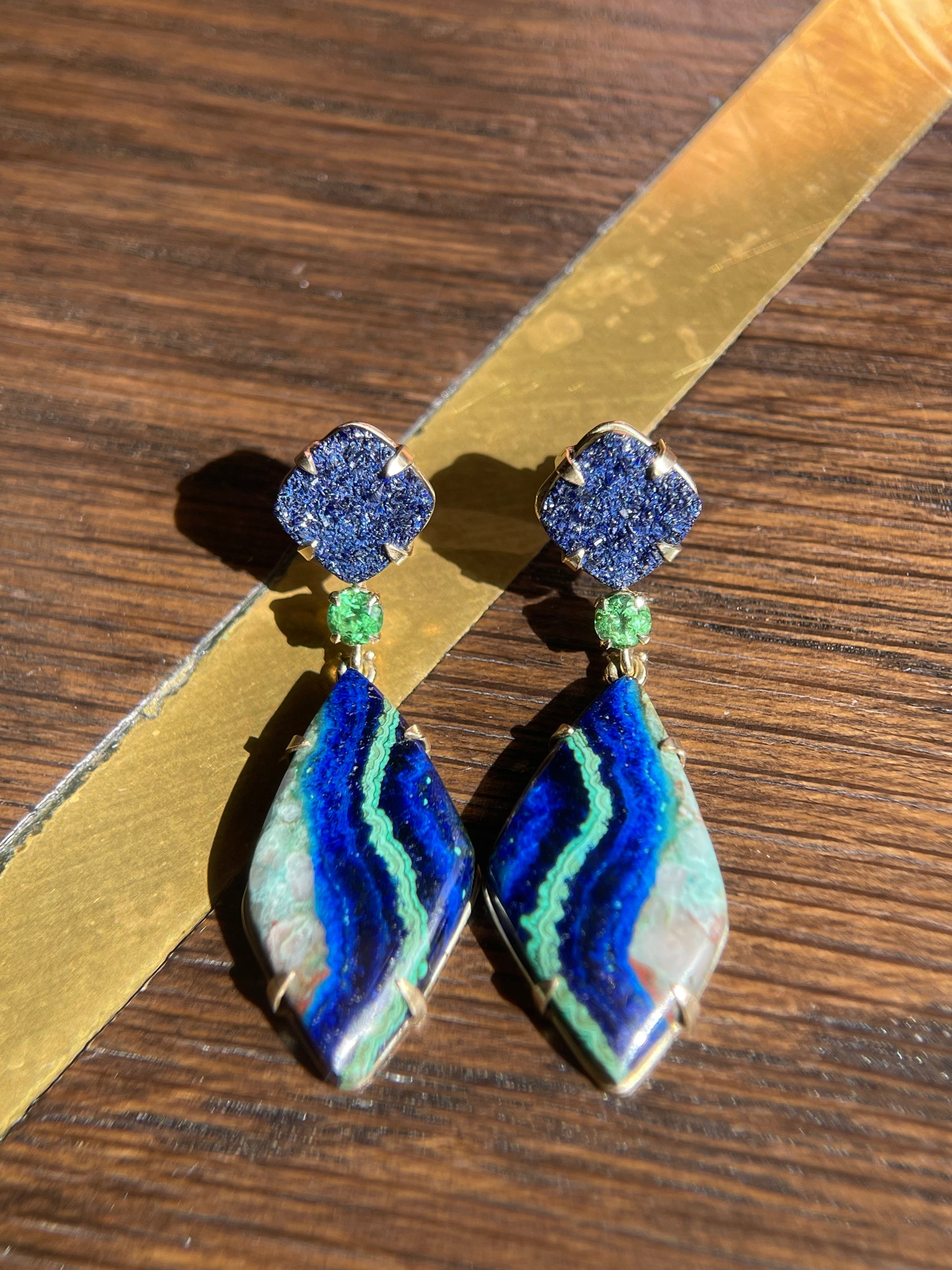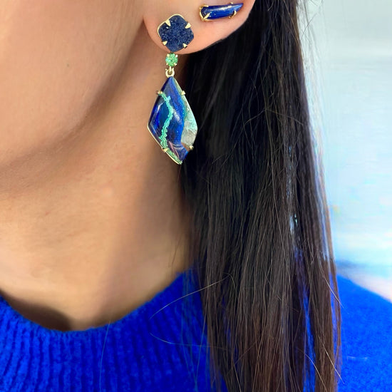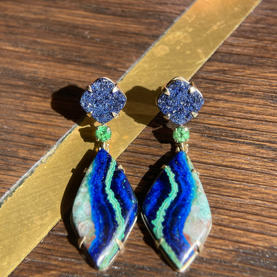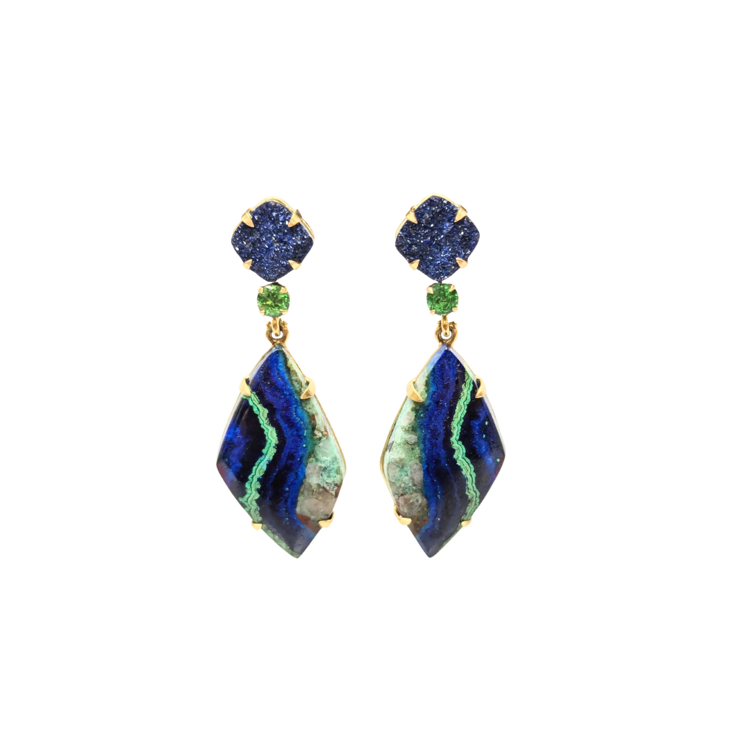 14K yellow gold earrings with azurite druzy, tsavorite garnet, and malachite/azurite