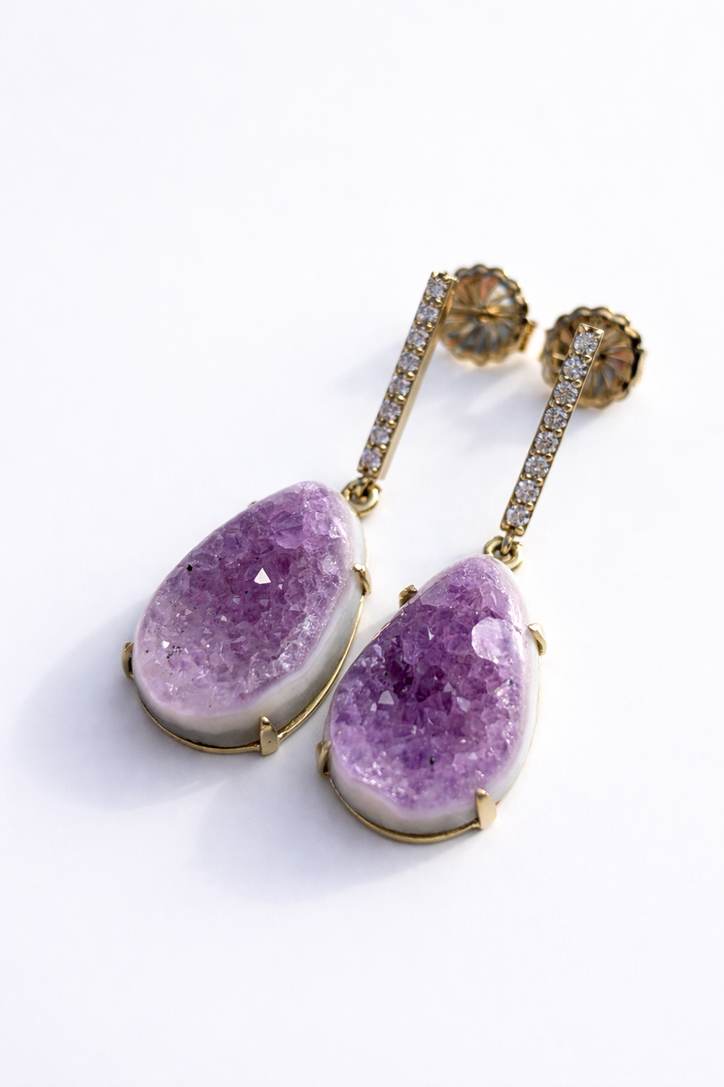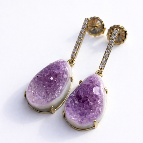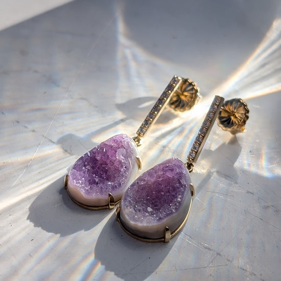 These earrings feature amethyst druzy slices, each unique in crystal formation, and suspended from slim pavé diamond bars. Lightweight and easy to wear, day or night.