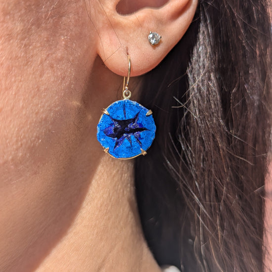 These threader earrings are hand-crafted from 14K yellow gold with miniature azurite geodes. Known for their unassuming exterior, azurite geodes reveal a breathtaking display of vibrant blue crystals when sliced open, making each pair truly one-of-a-kind.