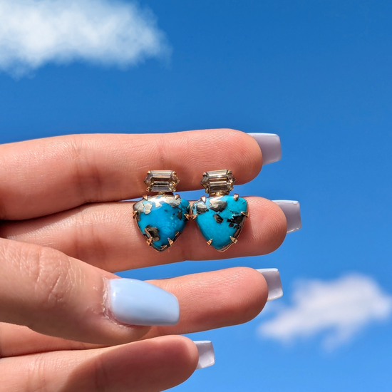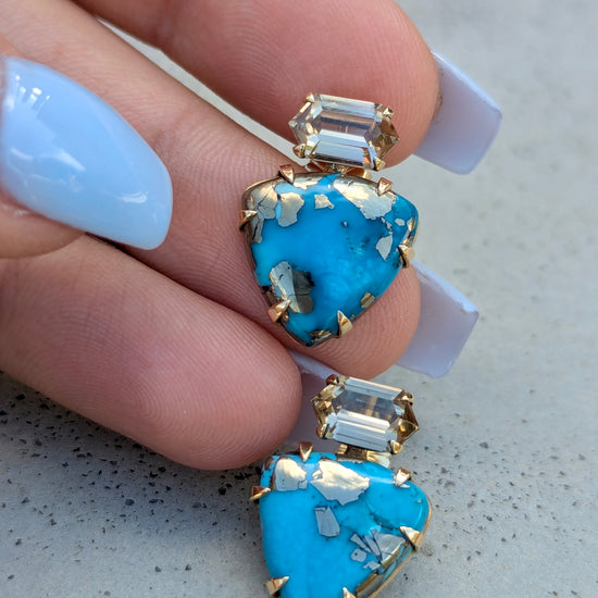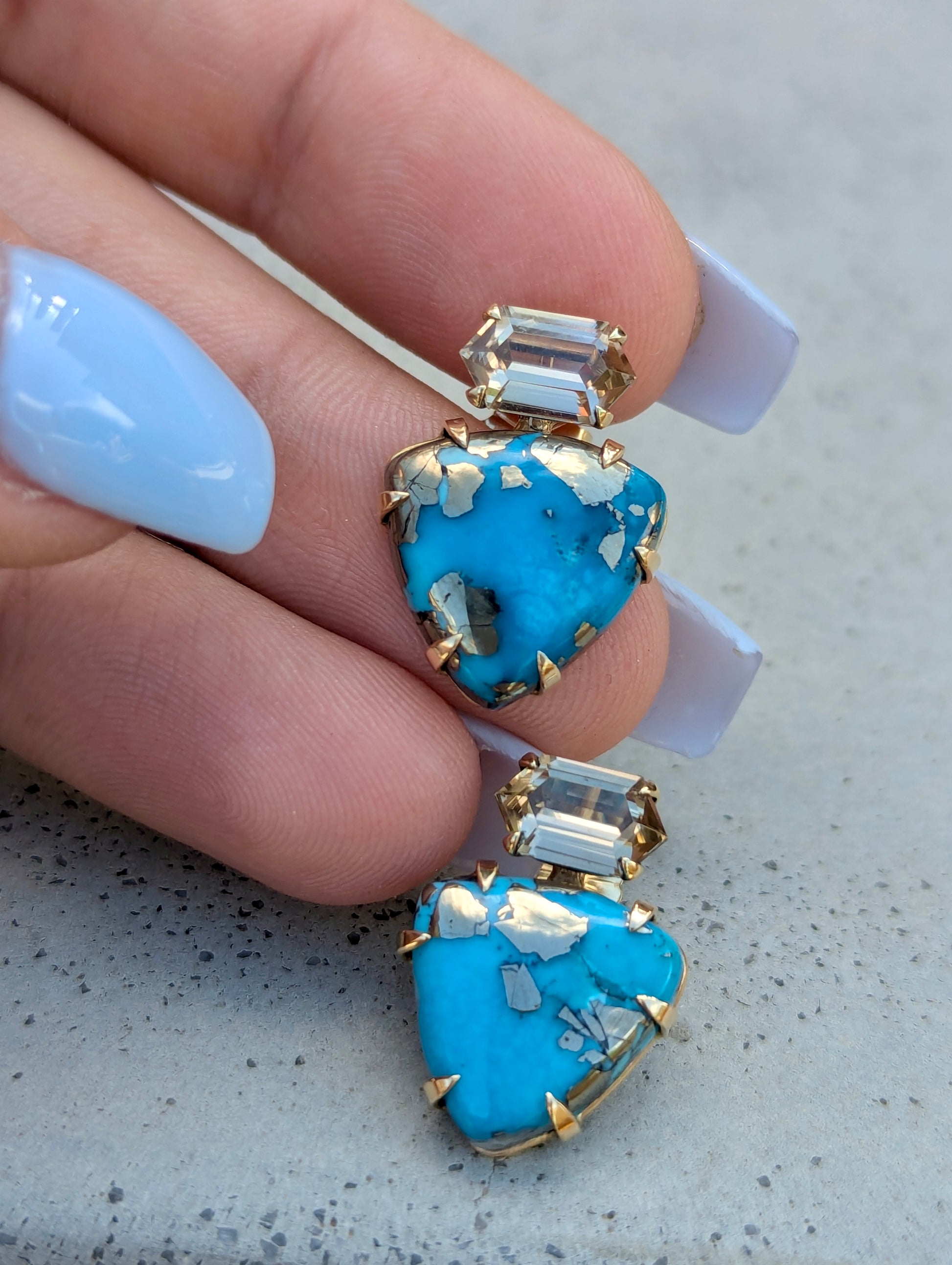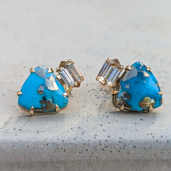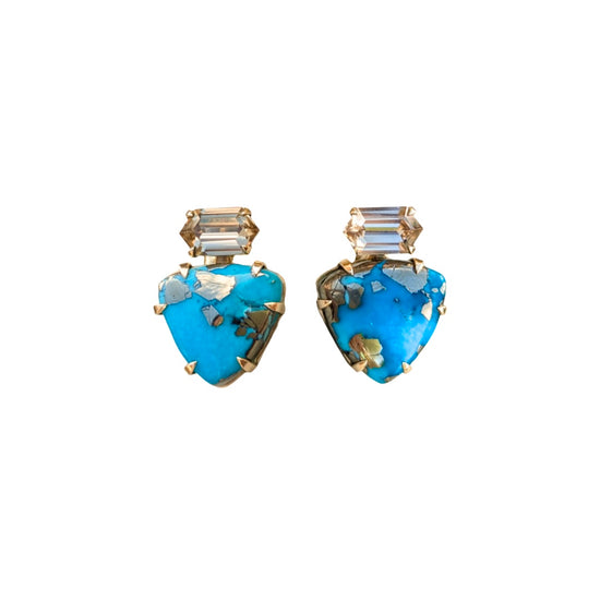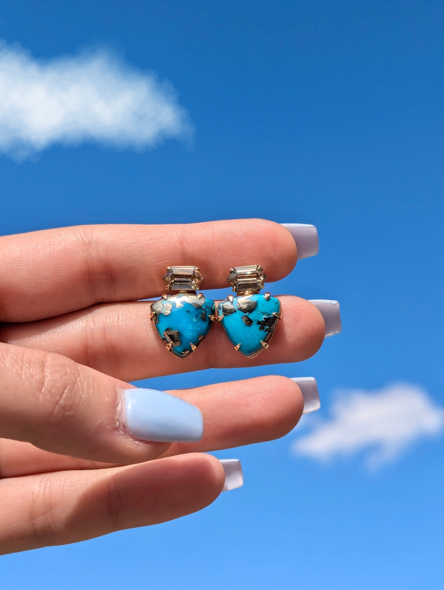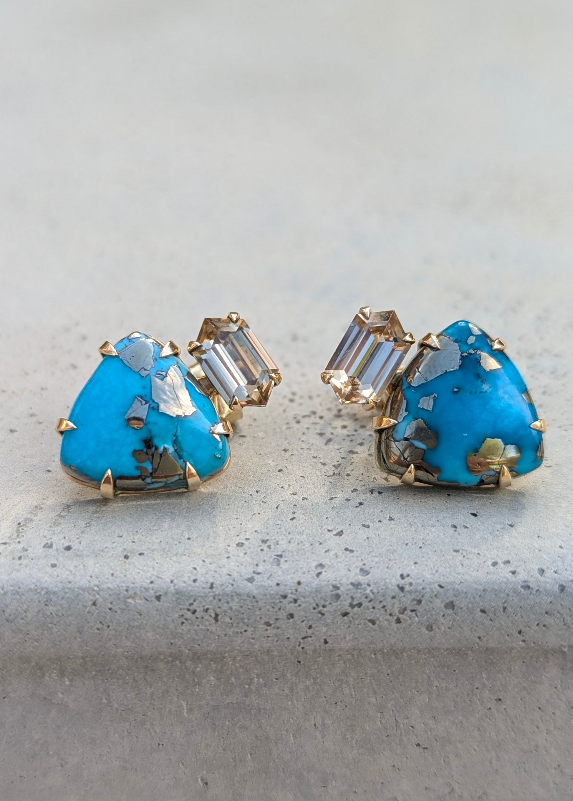 14K yellow gold earrings with Persian turquoise with pyrite and champagne zircon.