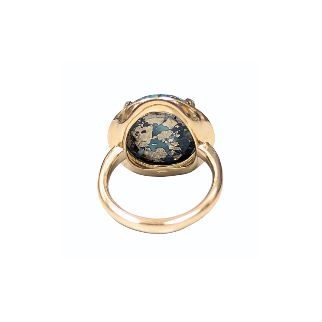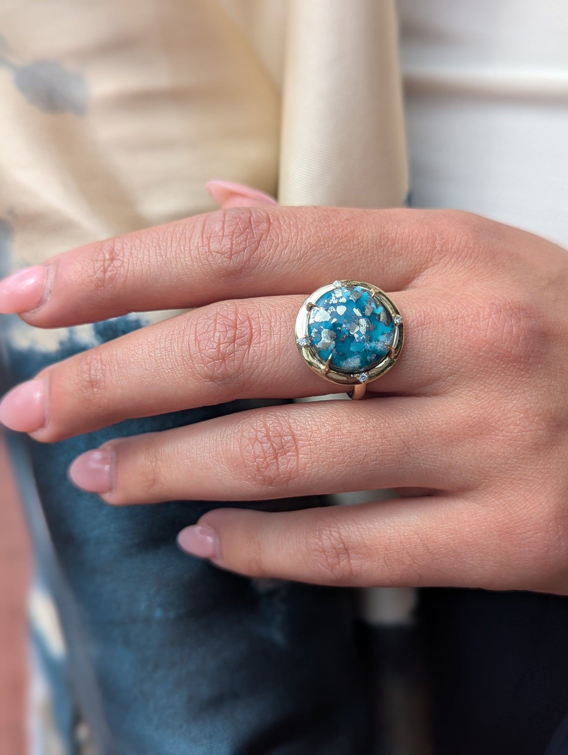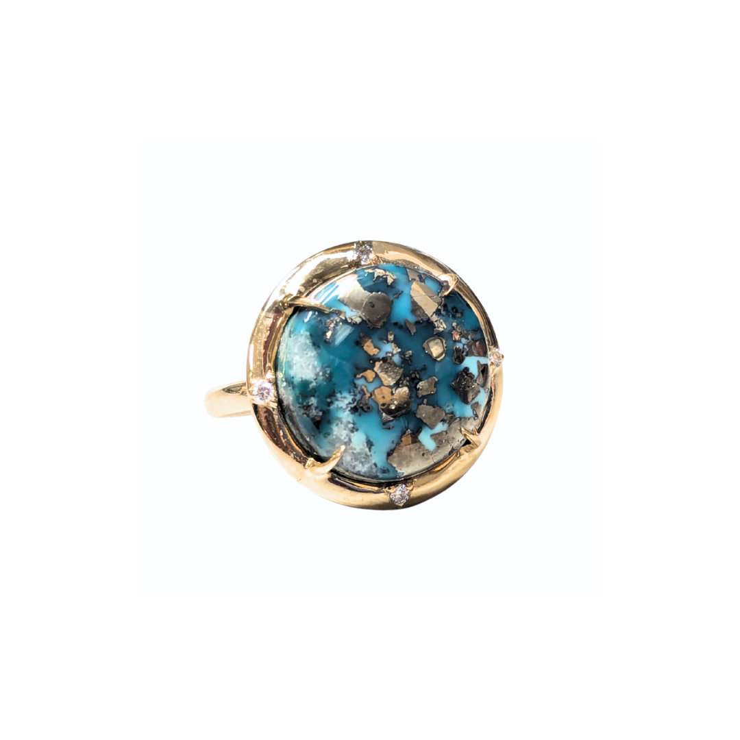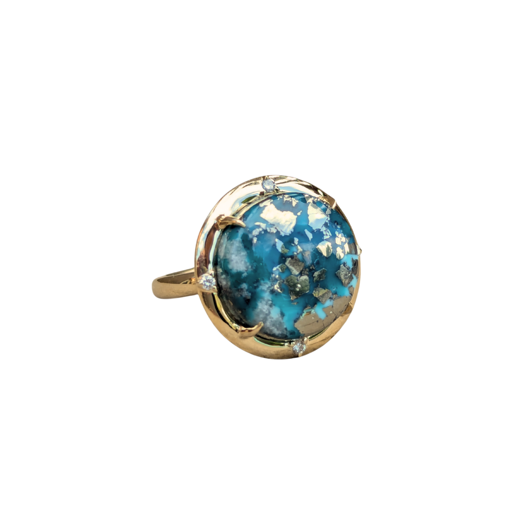 This one-of-a-kind ring features a round turquoise cabochon flecked with pyrite and is held in a sculptural 14K yellow gold setting with four small diamonds (0.05 total carats).