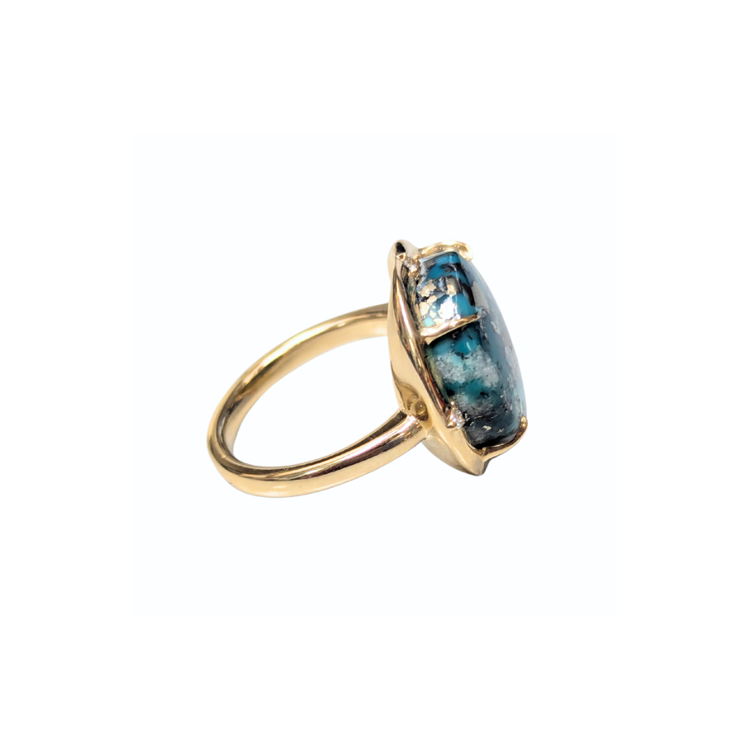 14K yellow gold one-of-a-kind ring with Persian turquoise in a size 7. Persian turquoise is known for its rich blue color and has been treasured for centuries for its beauty.