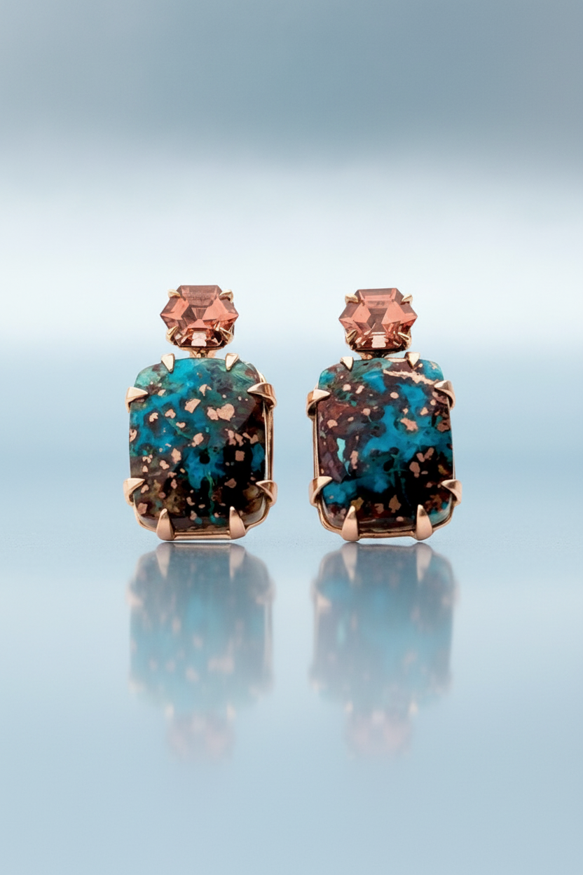 Introducing your new everyday essential: a one-of-a-kind pair of earrings with peach garnets paired with a richly patterned set of chrysocolla-copper. Hand-crafted in 14K rose gold, the warmth of the metal naturally compliments the copper flecks within the chrysocolla. Small in scale but full of life, these are the perfect starter piece for your Eleux collection.