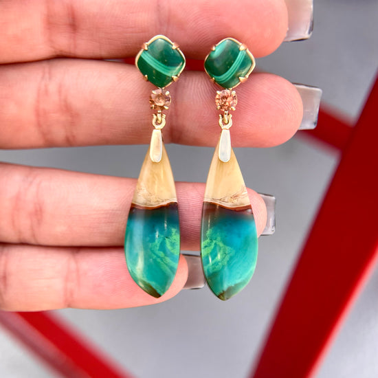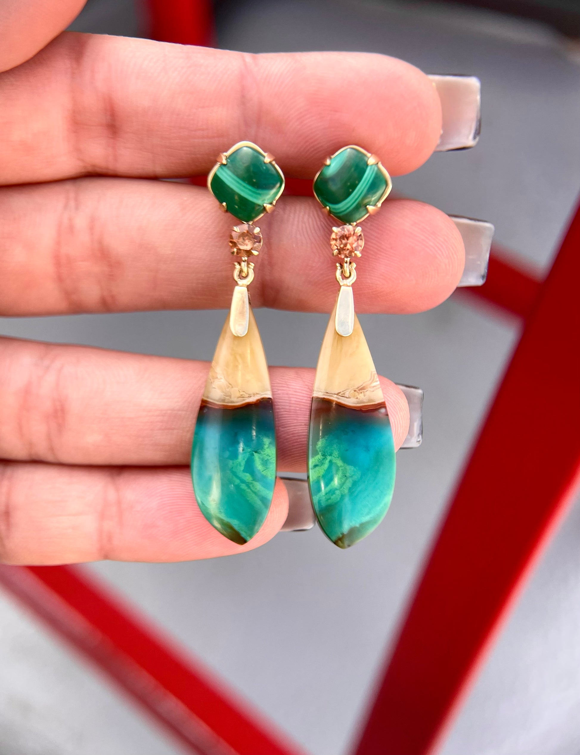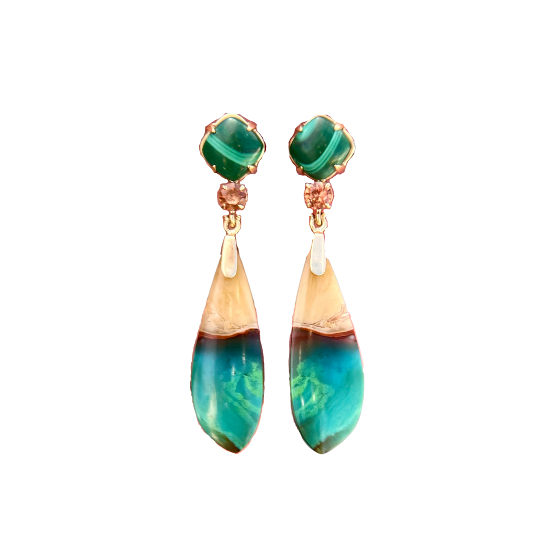 14K yellow gold one-of-a-kind earrings with malachite, orange sapphires, and opal wood