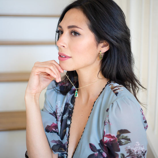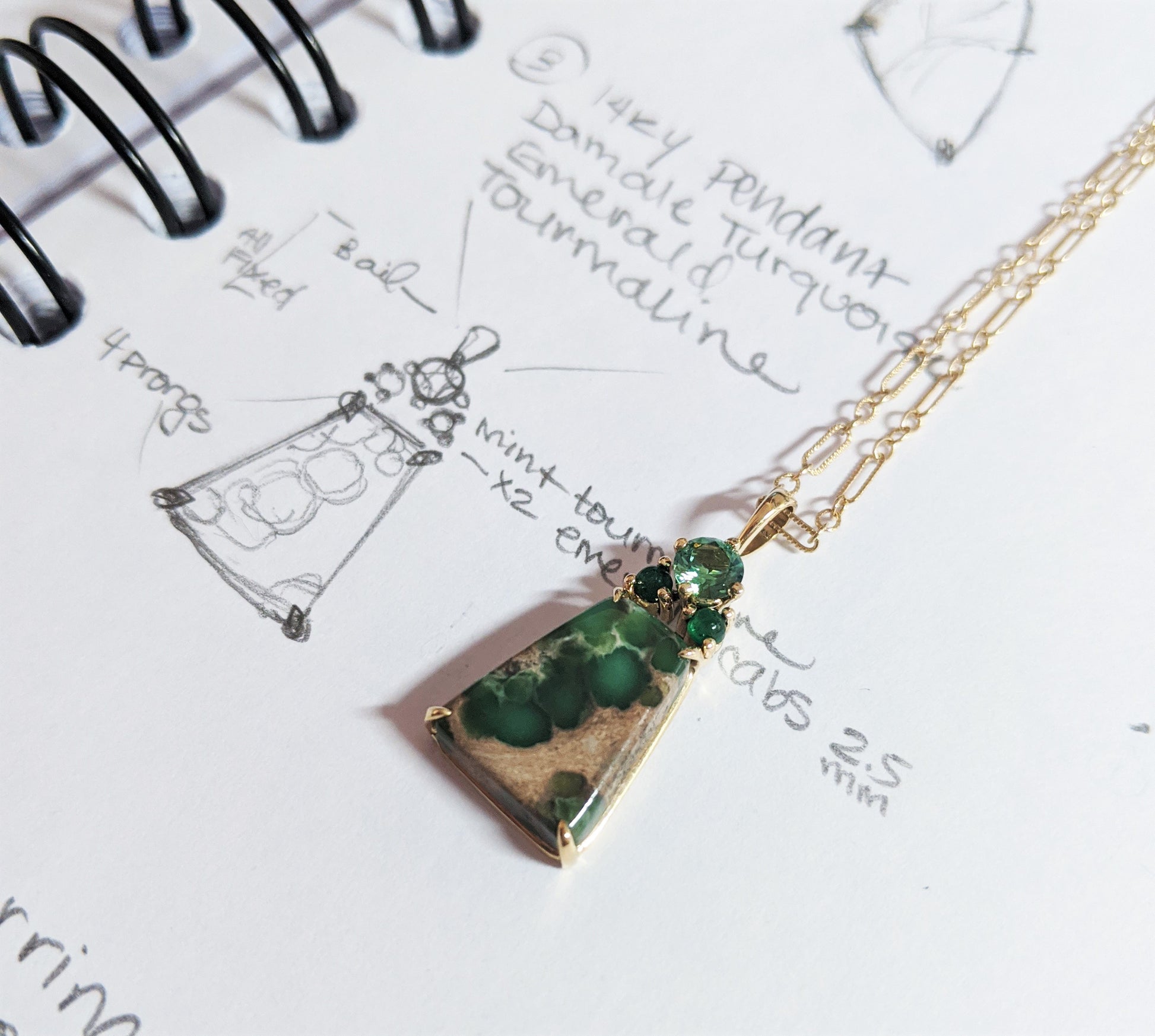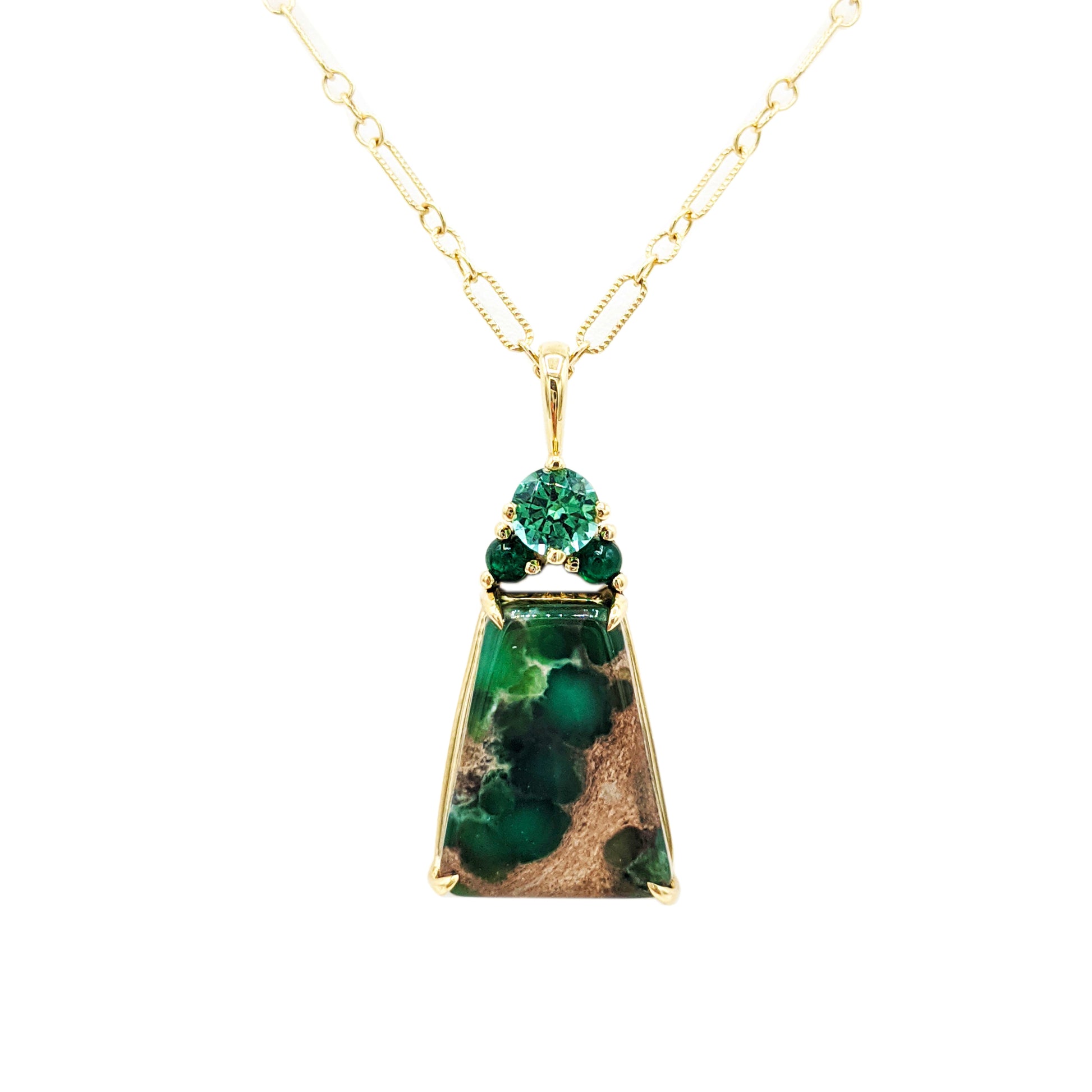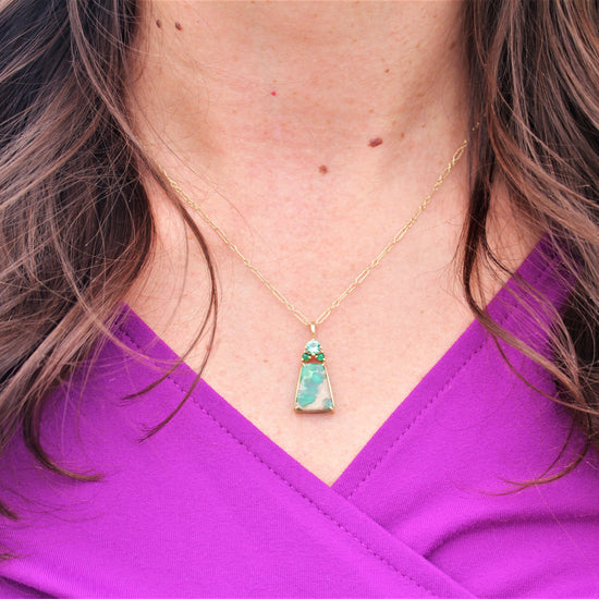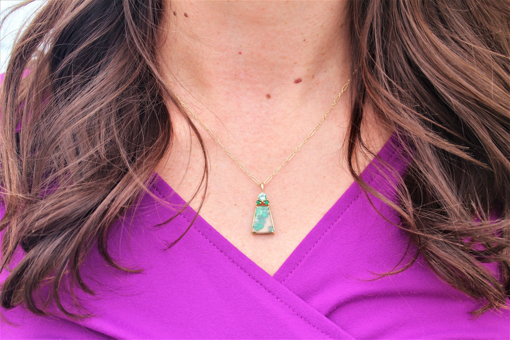 Wrapped in 14K yellow gold, the turquoise centerpiece is held with a hand-fabricated custom-fit backing ensuring a perfect fit and added security. The chain is adjustable and can be clasped to any link to alter the length. The chain can also be removed from the pendant to be worn separately as a layering component.