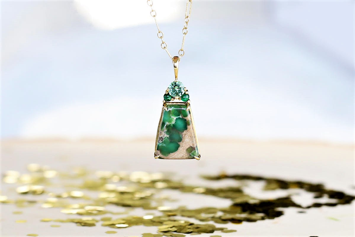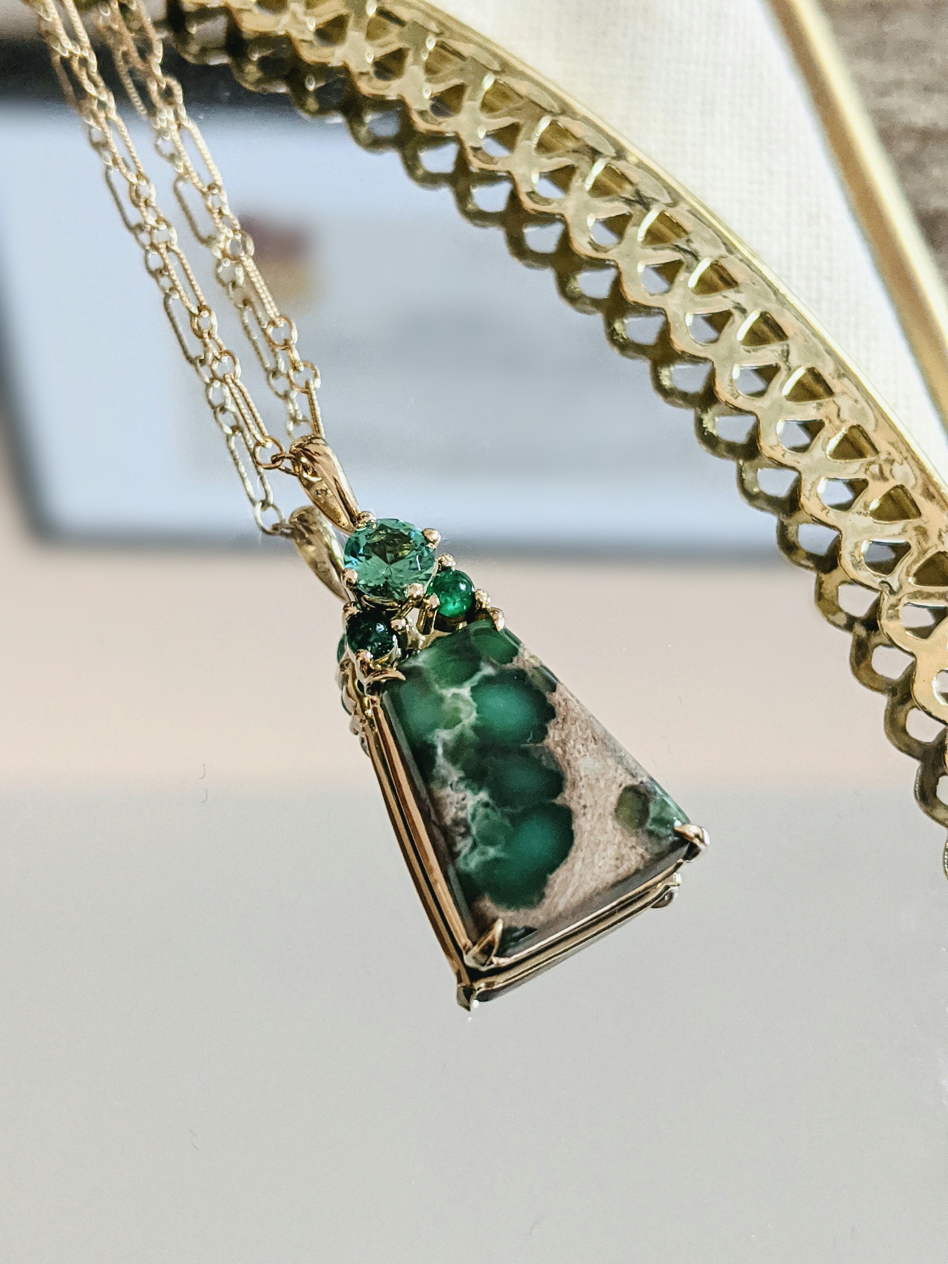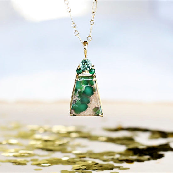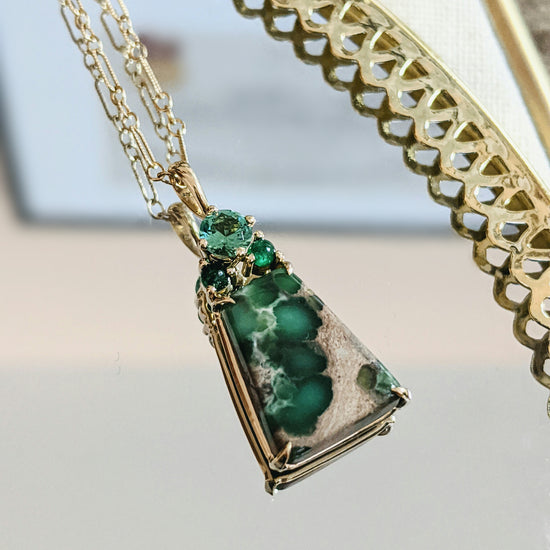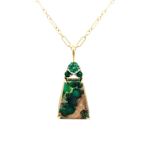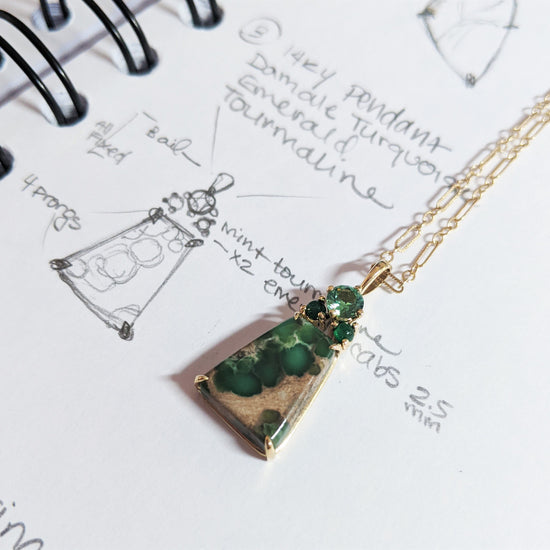 Damale Turquoise is sourced from the Damale mine in Nevada, near Carico Lake, and is considered a rare collector's turquoise. Most of the material found today, including the centerpiece stone in the necklace, are from older rough material mined long ago, as the mine primarily produces gold and a very small amount of turquoise. Known for it's varied shades of brilliant green, turquoise from this region is highly unique, collectible, and uncommon due to the vibrant coloring and limited production.