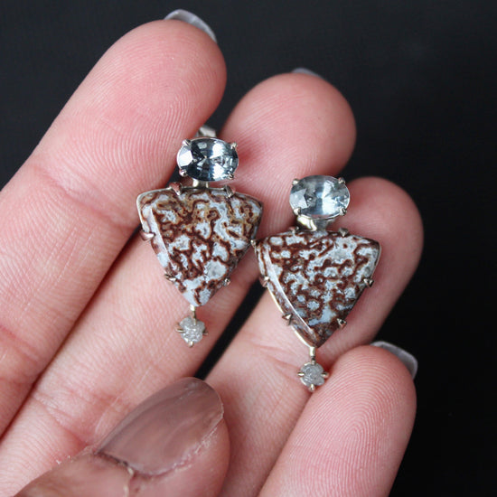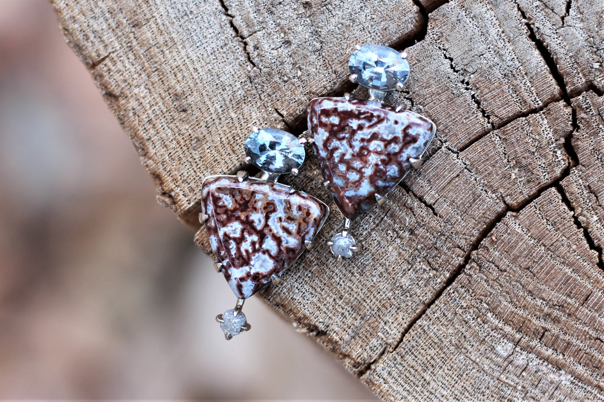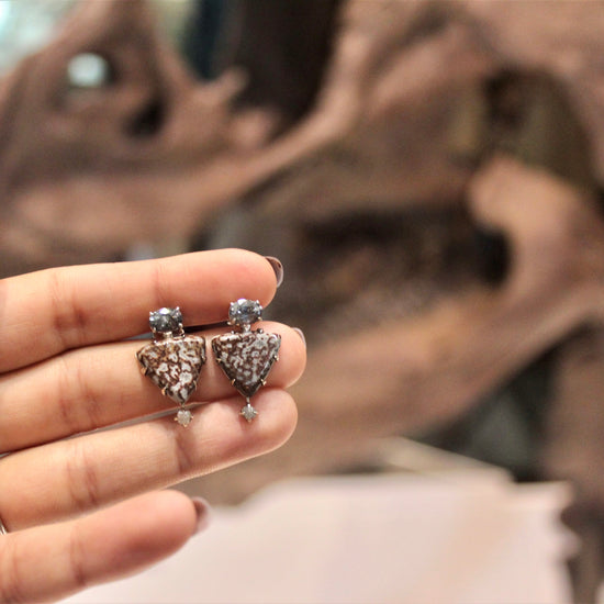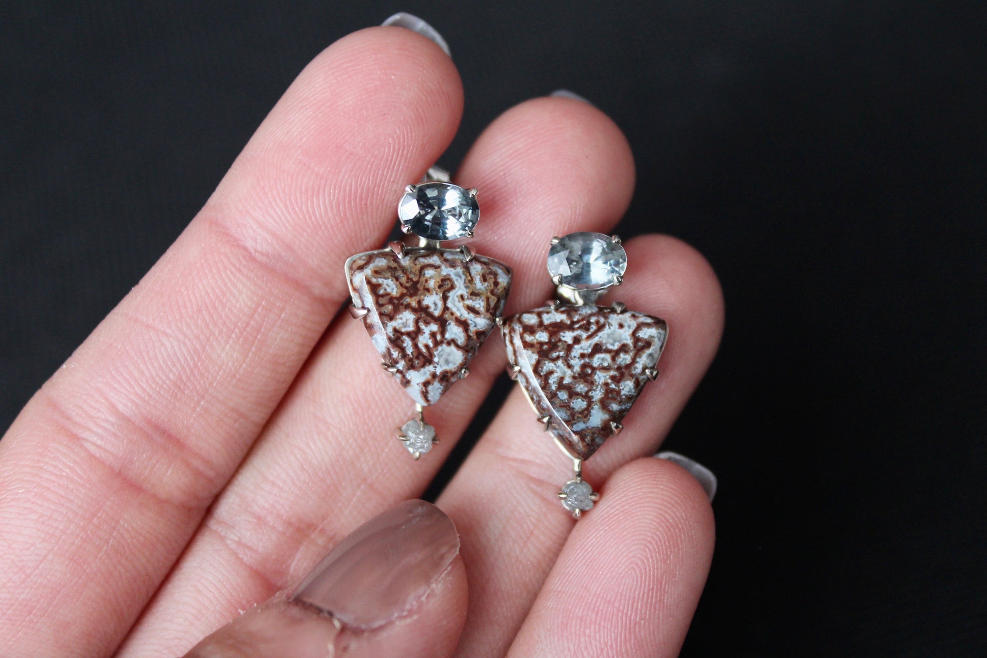 14k white gold prong settings surround an oval grey spinel, triangular dinosaur bone, and small rough grey diamonds. Earrings measure approximately 1 inch in length.