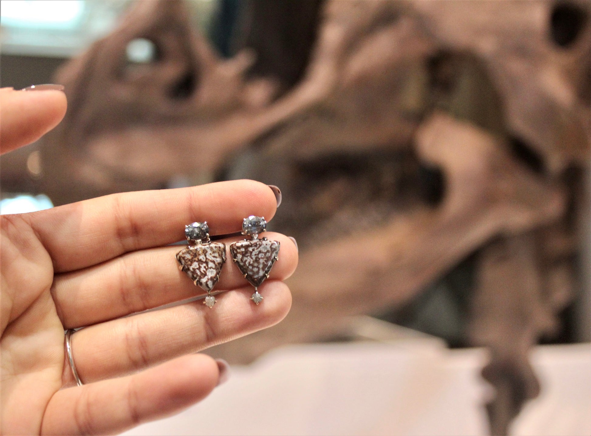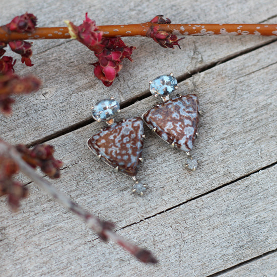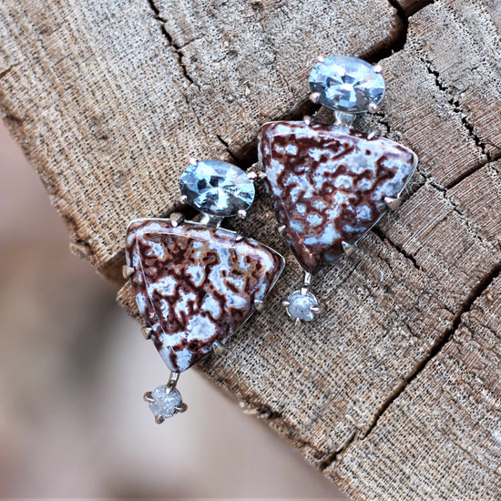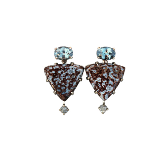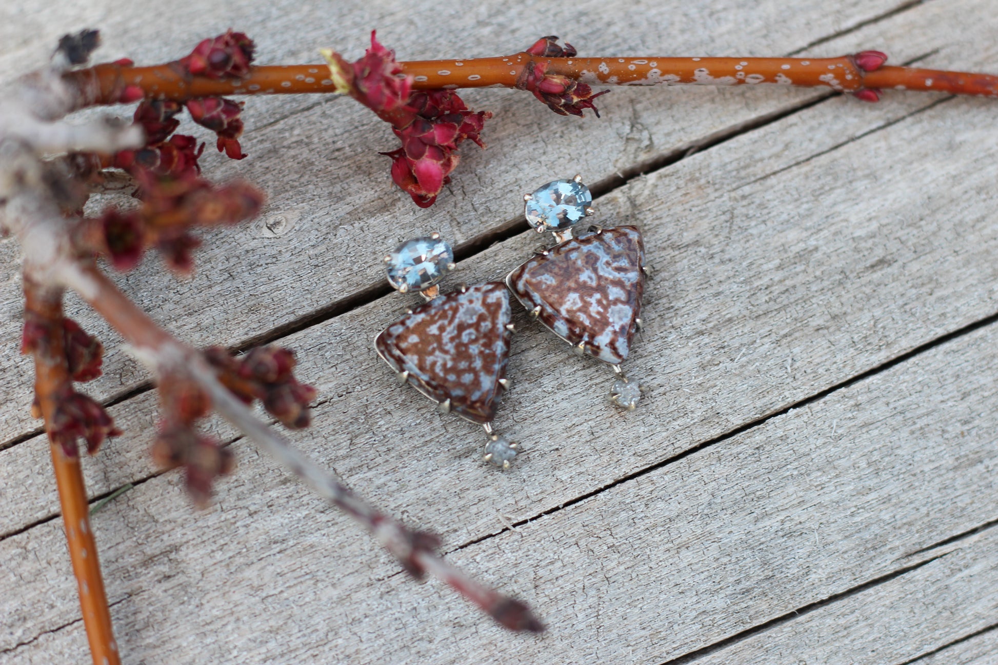 14k white gold prong settings surround an oval grey spinel, triangular dinosaur bone, and small rough grey diamonds. Earrings measure approximately 1 inch in length.