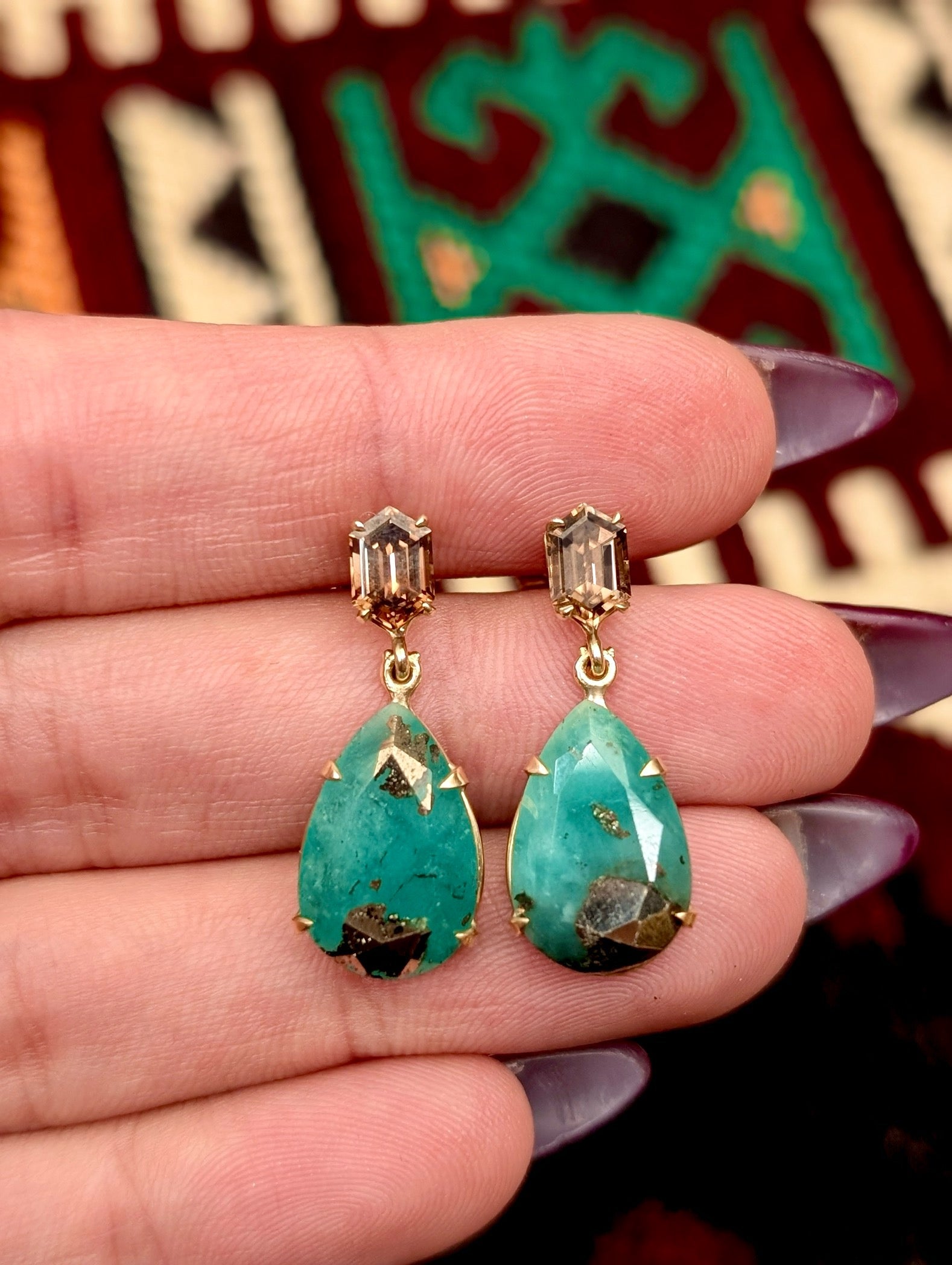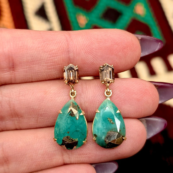 14K yellow gold earrings with hexagon cut zircons weighing 2.77 total carats, paired with emerald pear shape faceted drops.