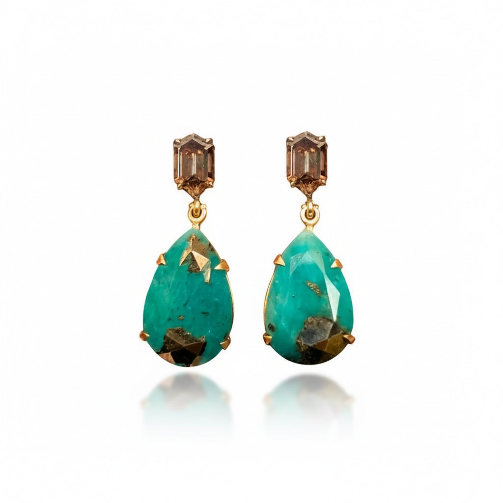 The smoky brown zircons compliment the vibrant green of the emeralds, and their structured hexagon shape complements the sharp, metallic formations of the pyrite crystals within the emeralds.