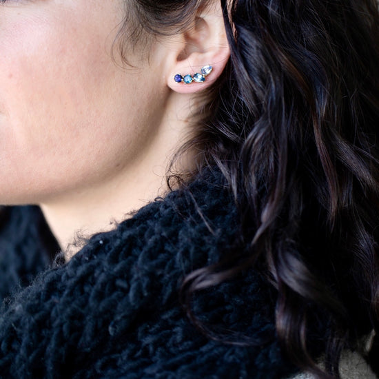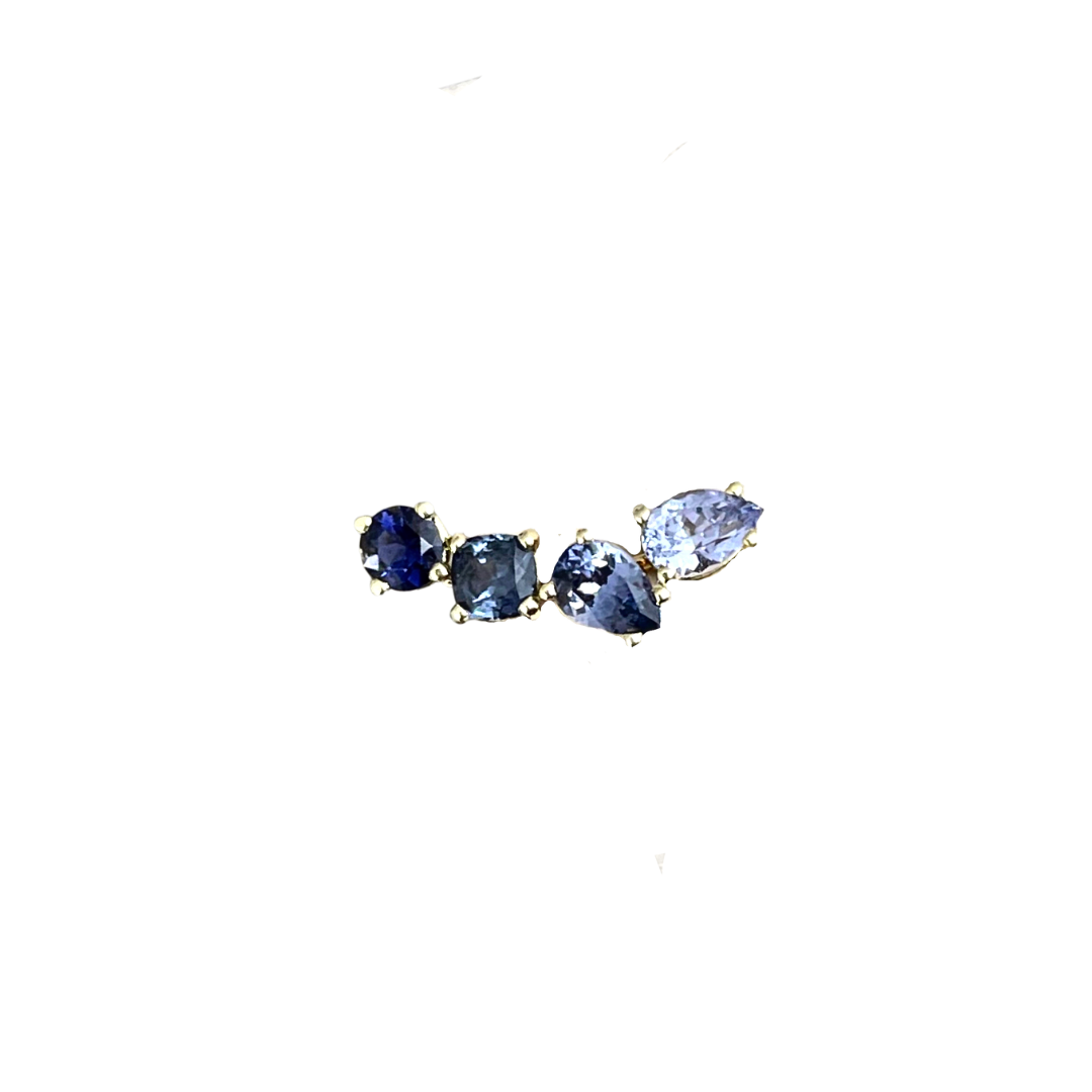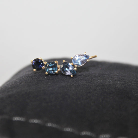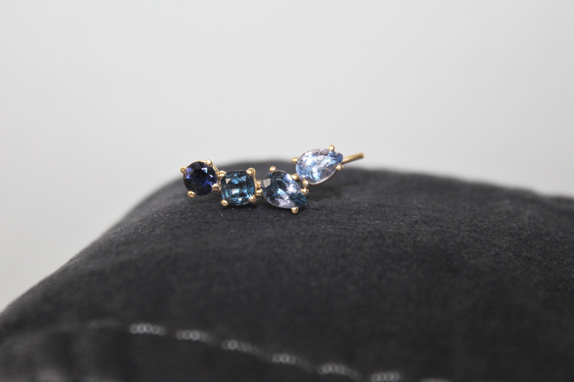 14K yellow gold cluster style ear climber with spinels (pear shape and cushion) and iolite (round).