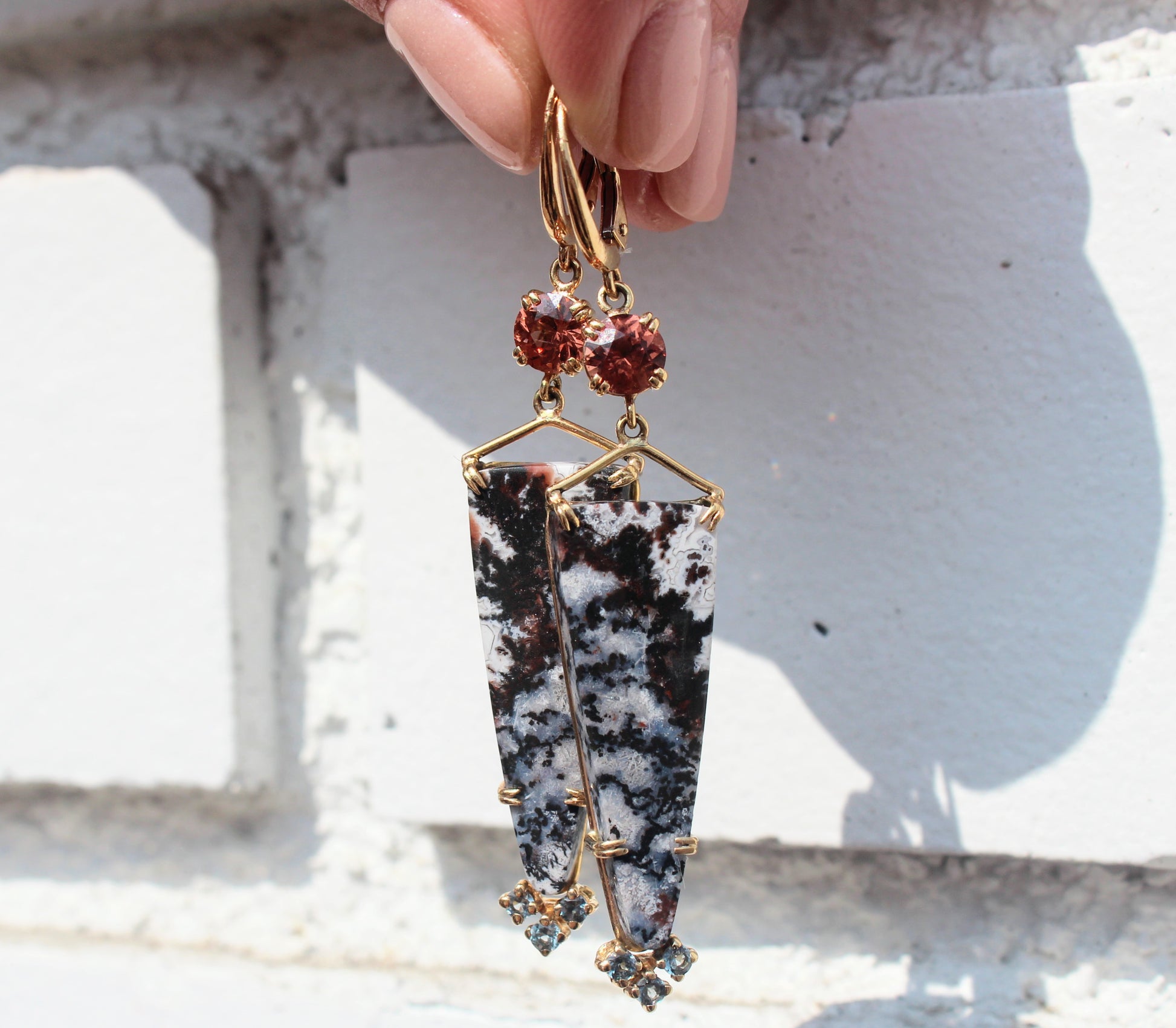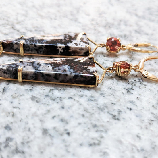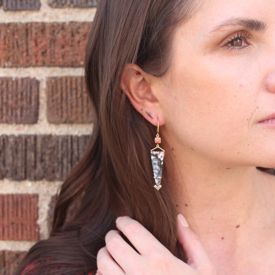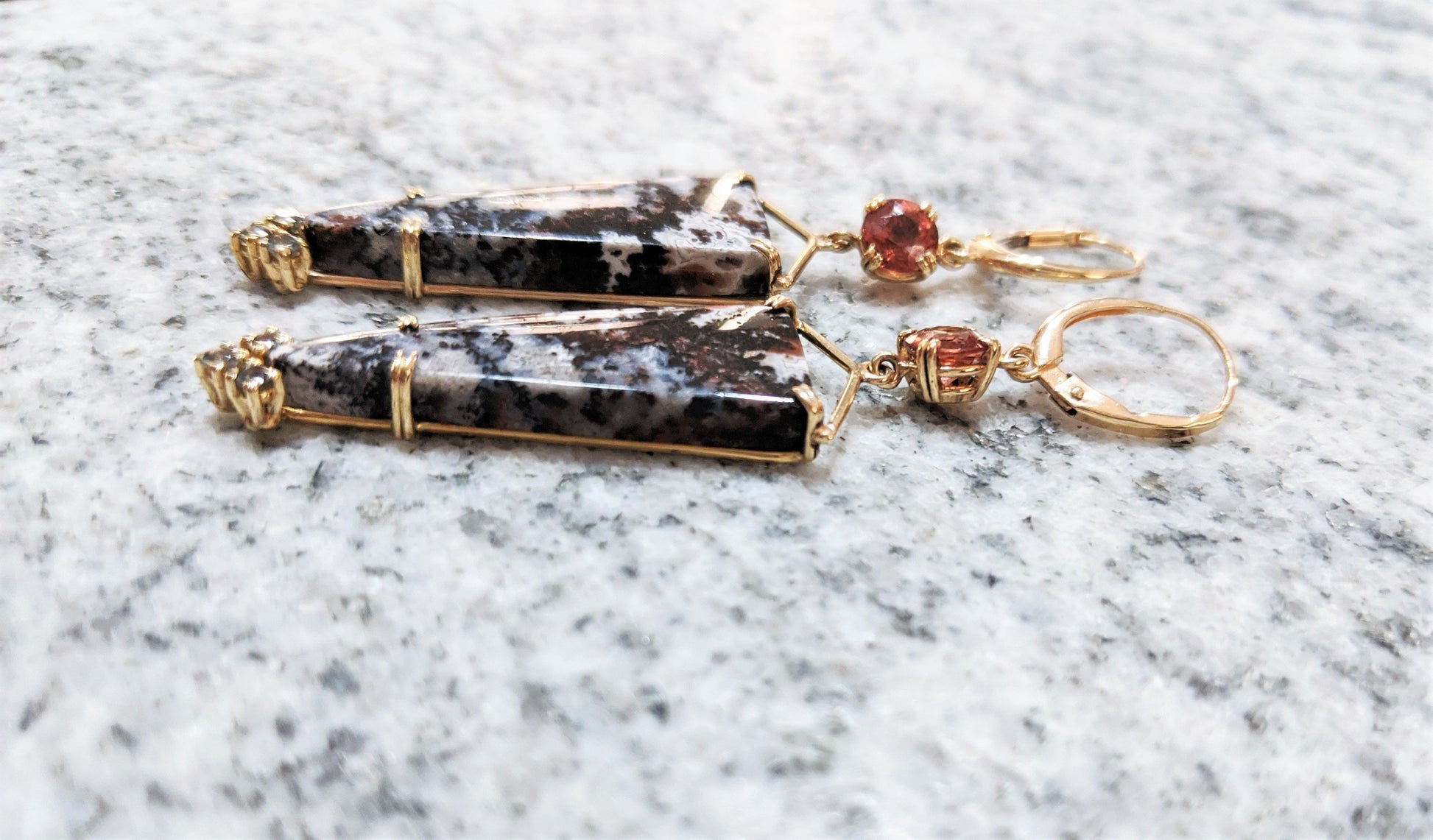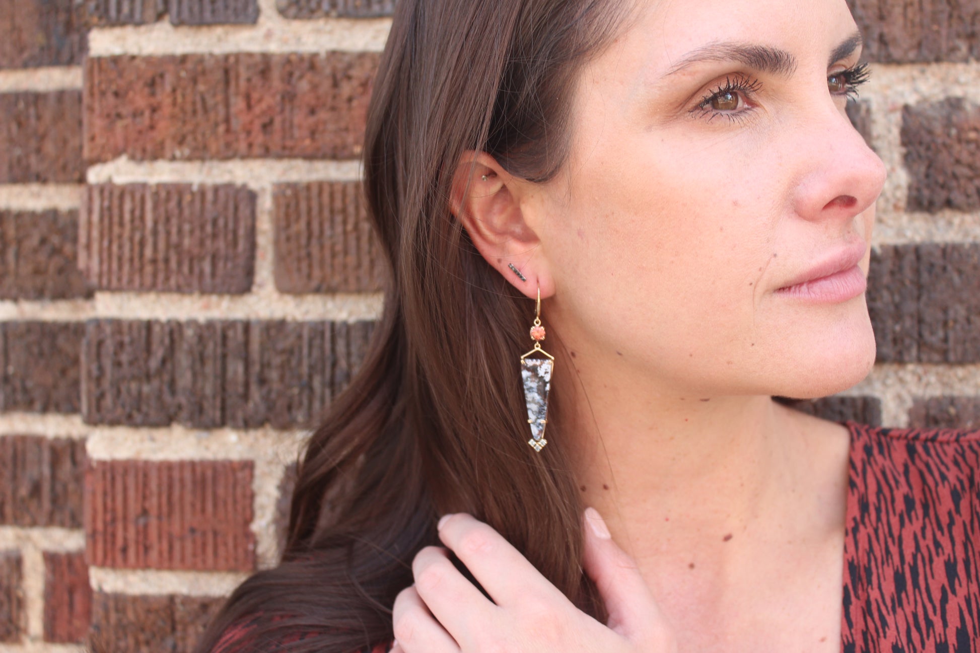 This piece is made with a custom fit, hand-fabricated gold backing that follows the exact shape of the jasper. The lever-back ear hook clicks into place ensuring security. Double claw prongs add character and edge!