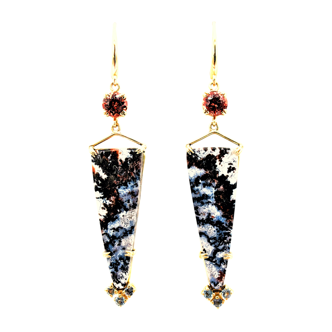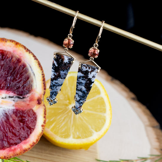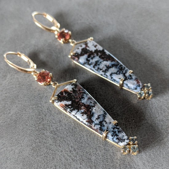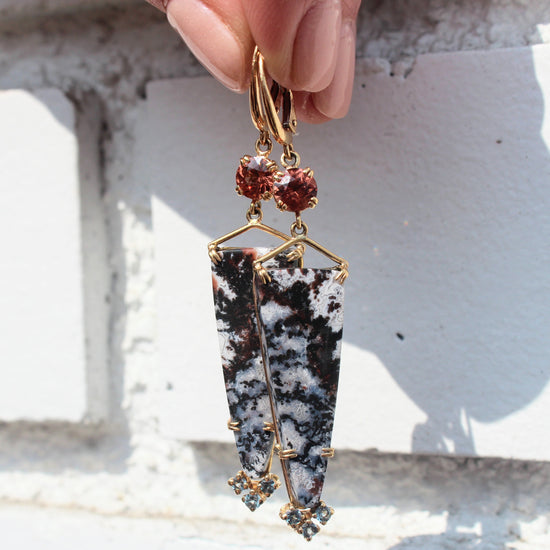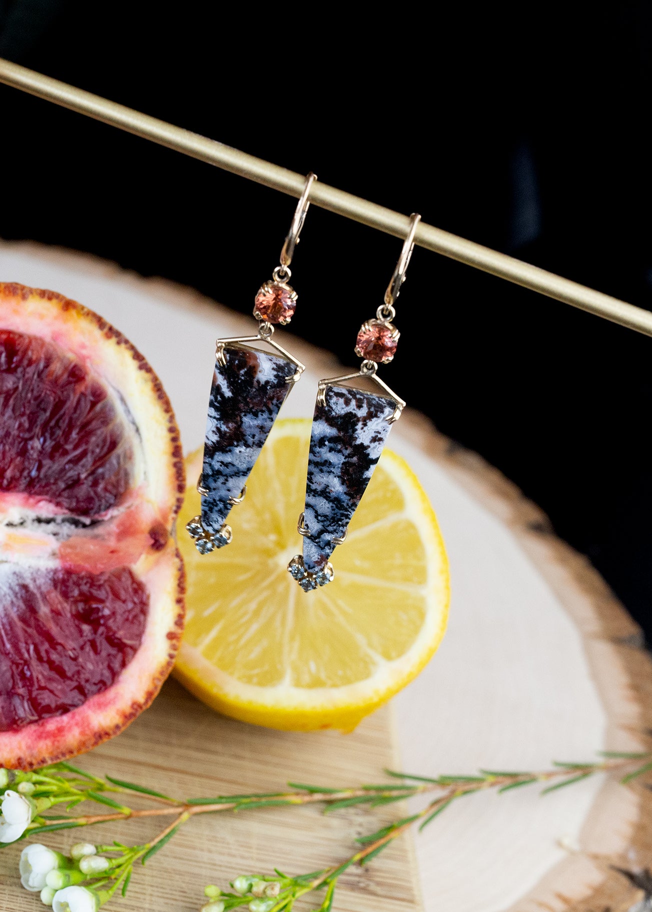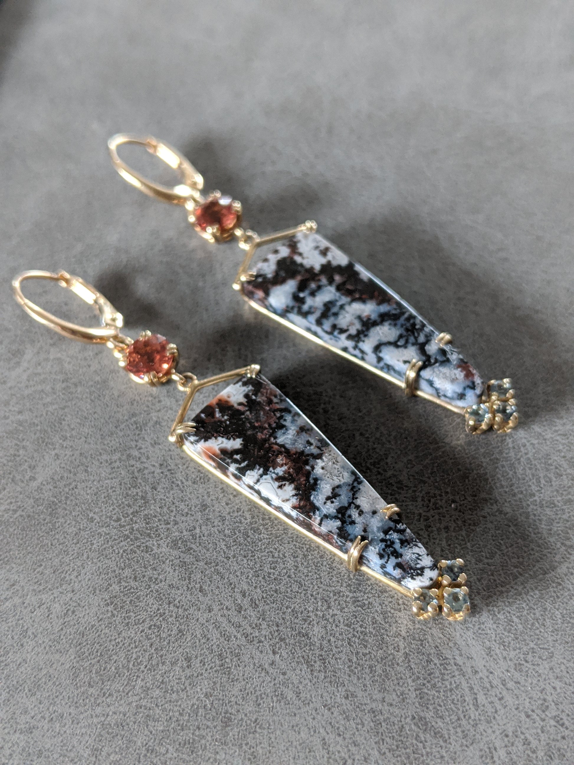 This piece is made with a custom fit, hand-fabricated gold backing that follows the exact shape of the jasper. The lever-back ear hook clicks into place ensuring security. Double claw prongs add character and edge!