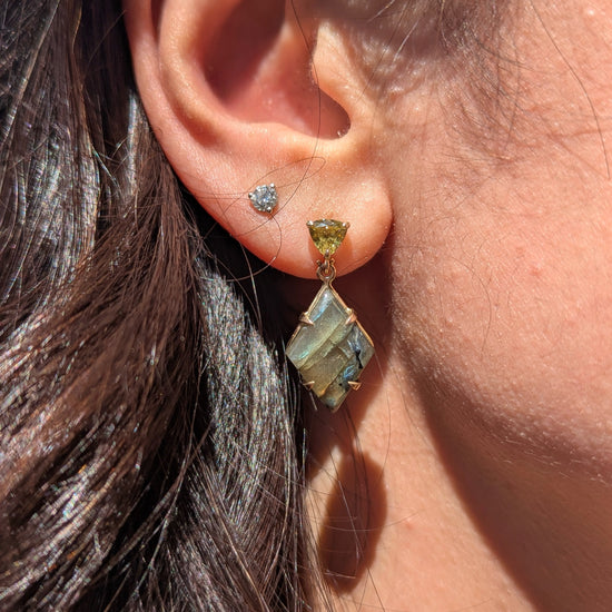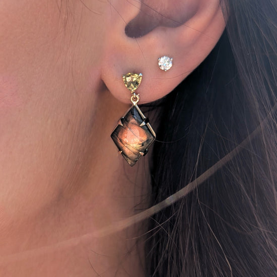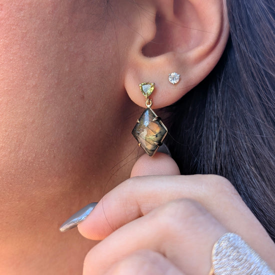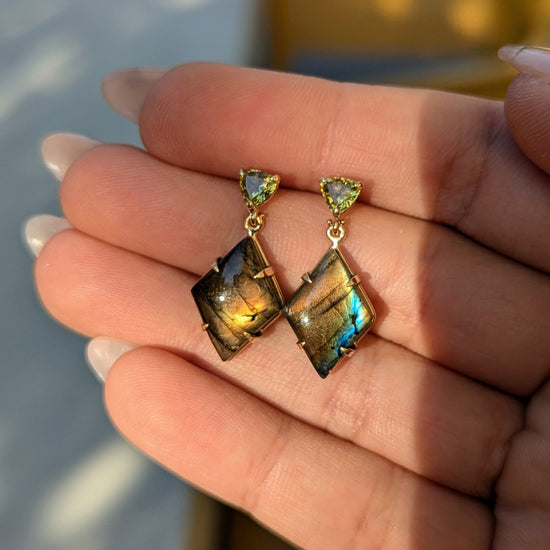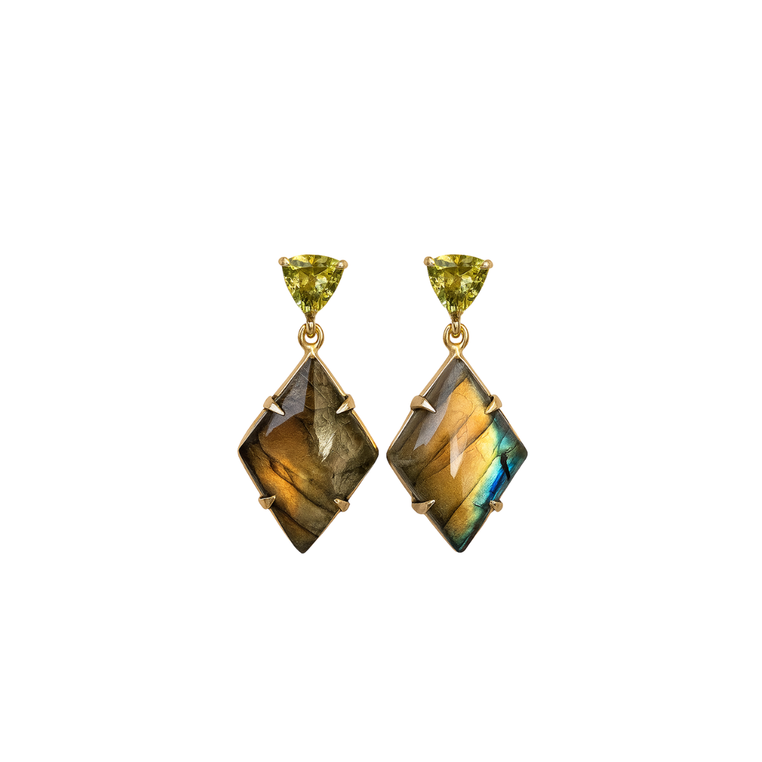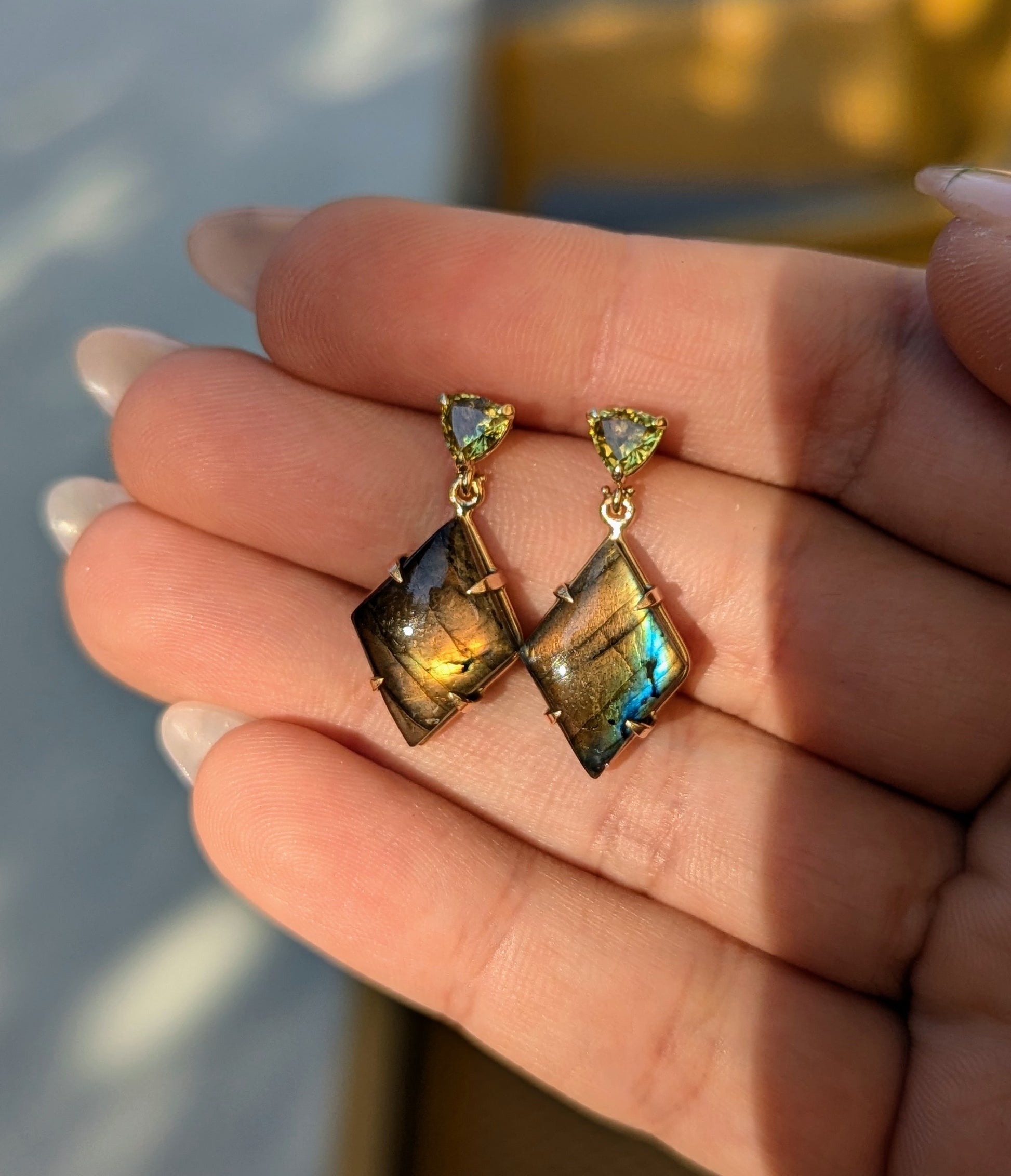 14K yellow gold earrings with green-yellow Mali garnets and labradorite cabochons. The shorter drop makes them perfect for everyday wear, while bold flashes of yellow and orange light up with every movement.