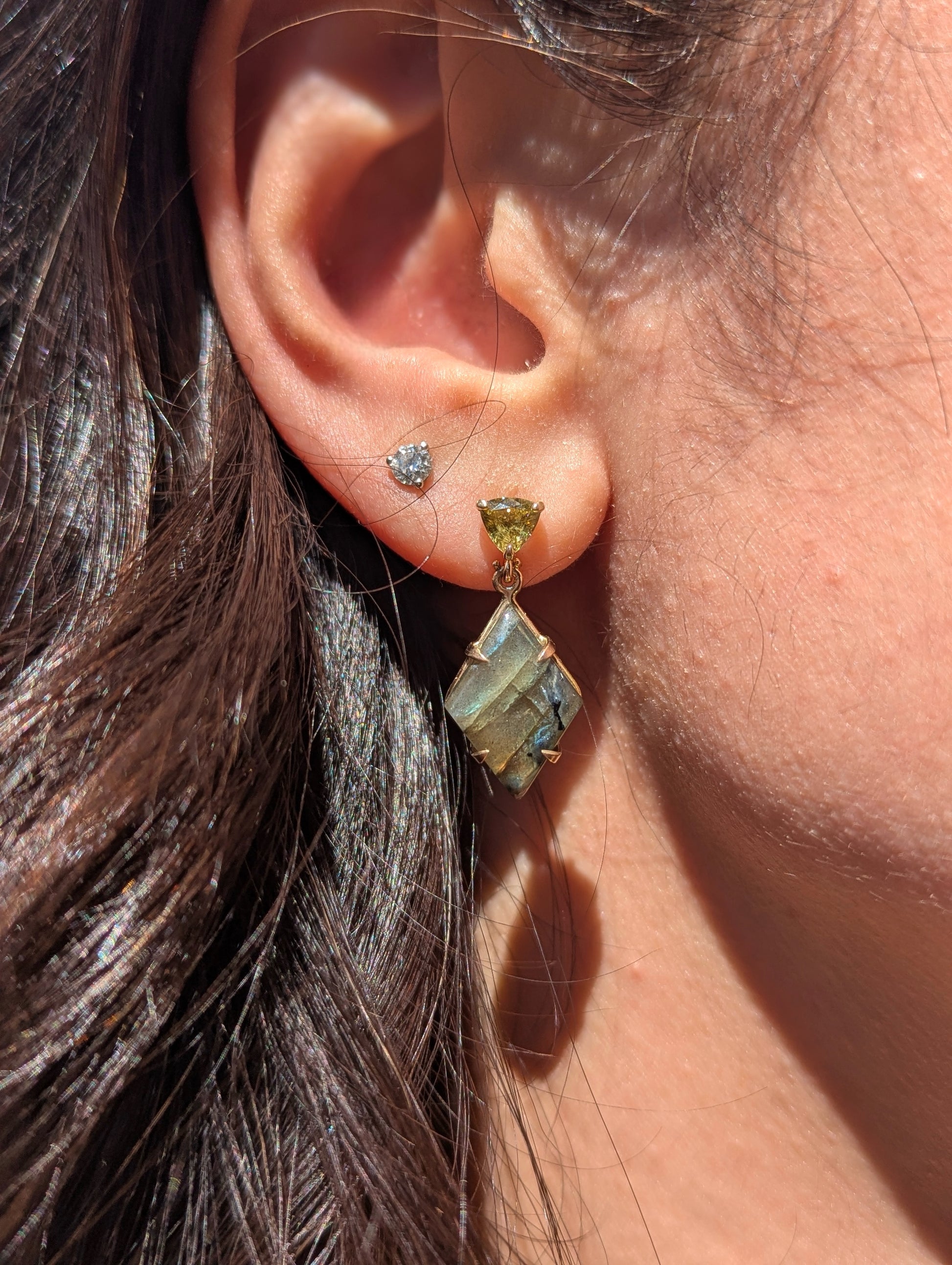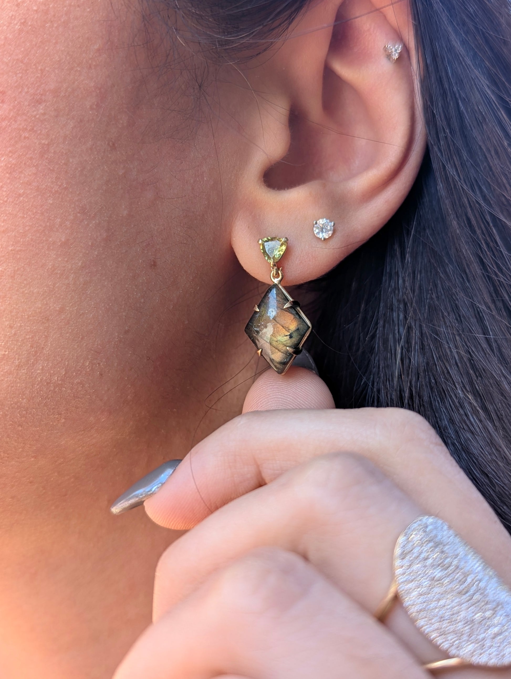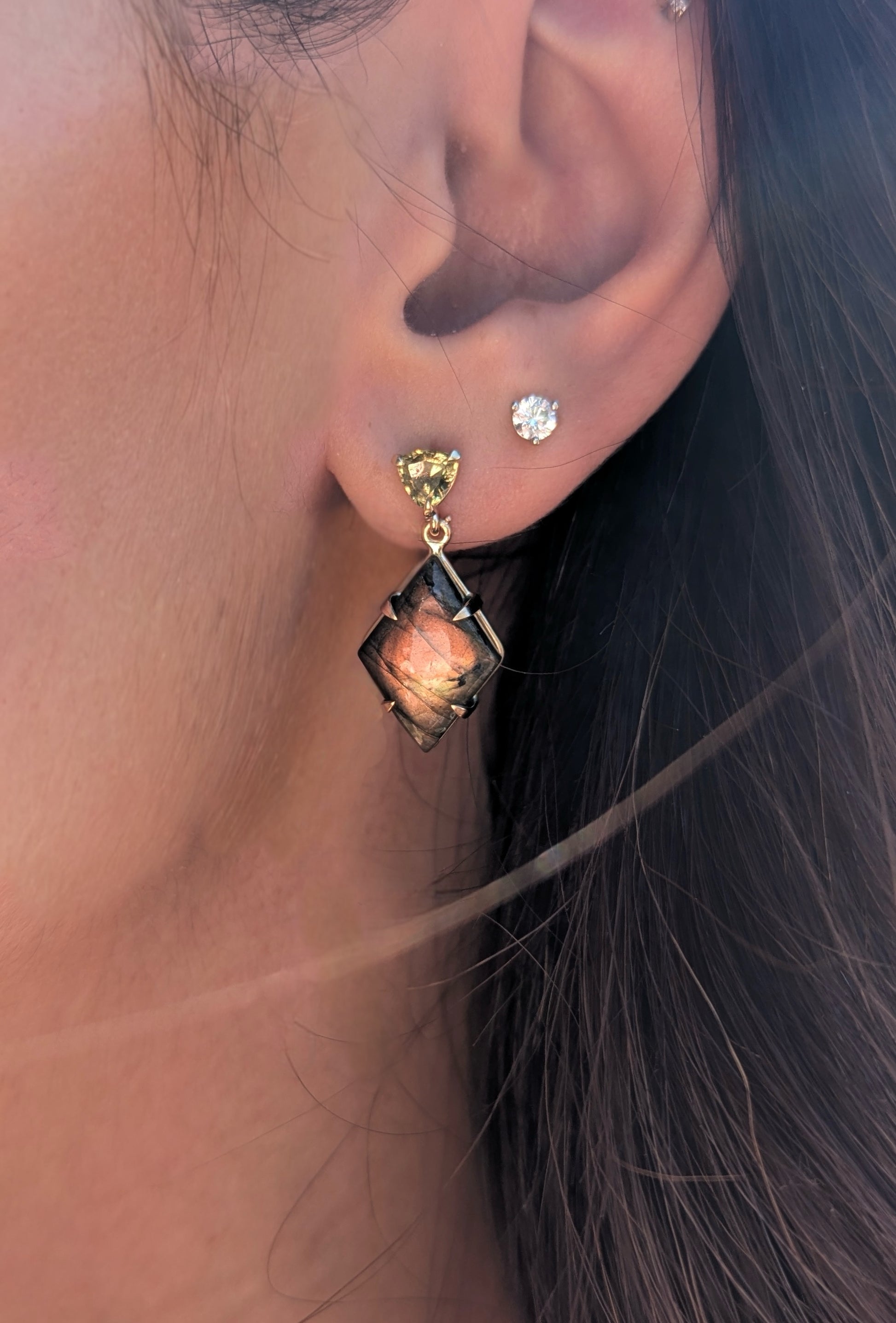 14K yellow gold earrings with green-yellow Mali garnets and labradorite cabochons. The shorter drop makes them perfect for everyday wear, while bold flashes of yellow and orange light up with every movement.