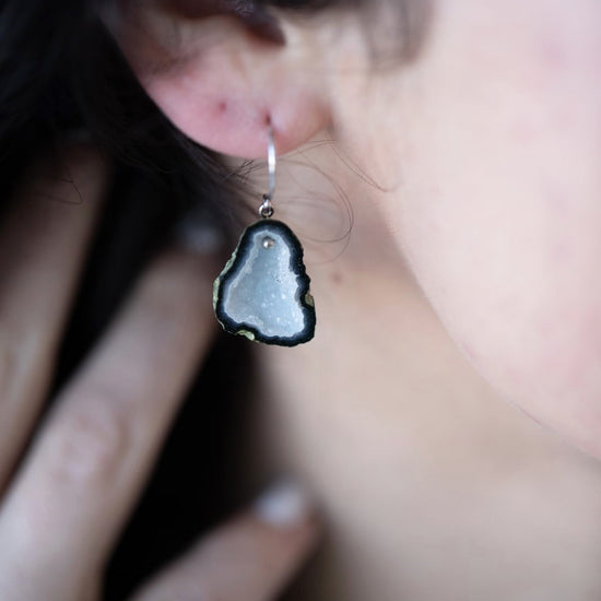14K white gold geode earrings with striking grey and black geodes, originating from Mexico. They are a versatile accessory that elevate any outfit.