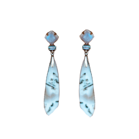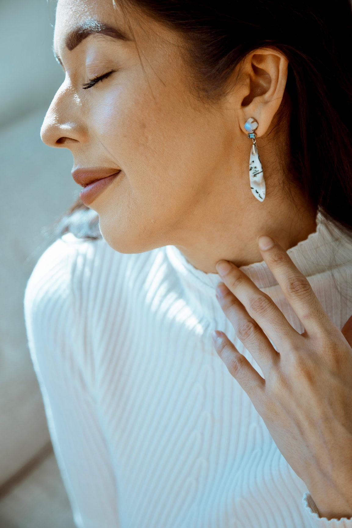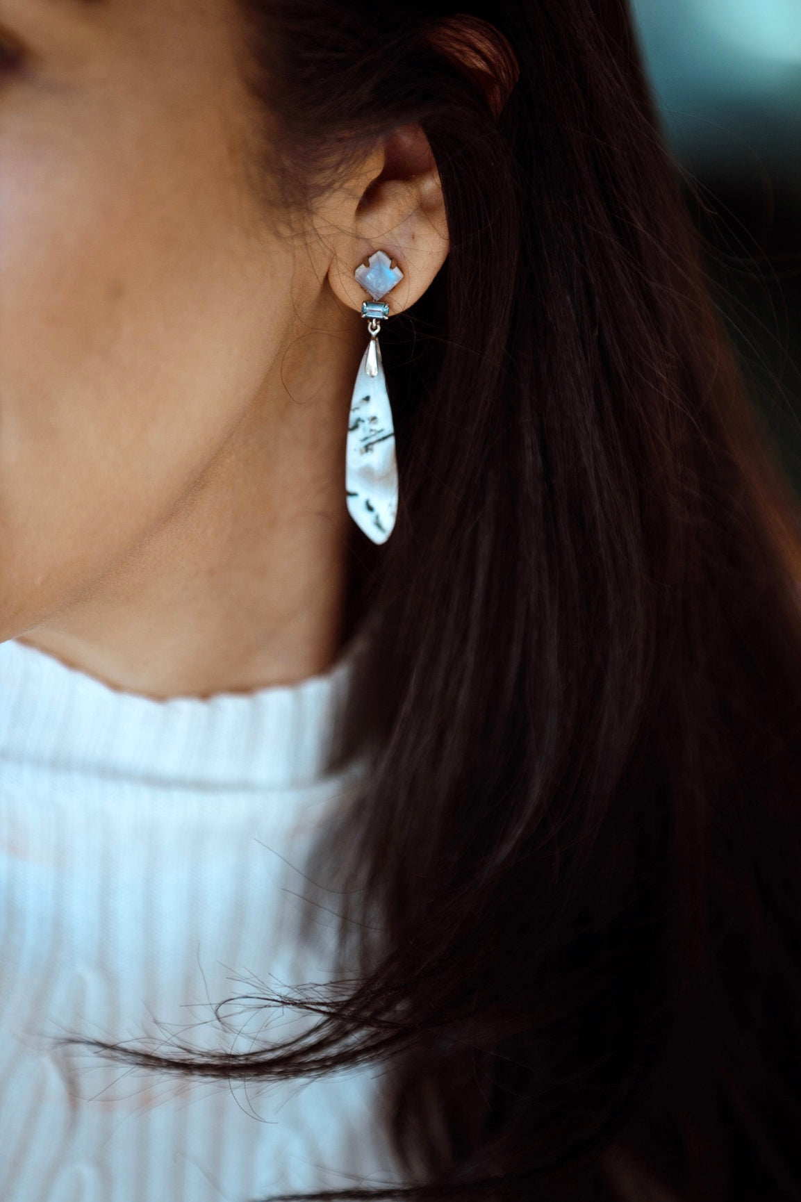 14K white gold earrings with moonstone, teal sapphires, and moss agate