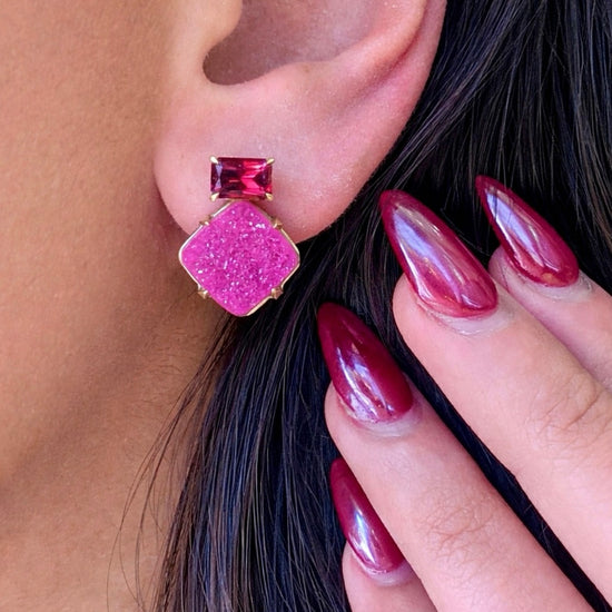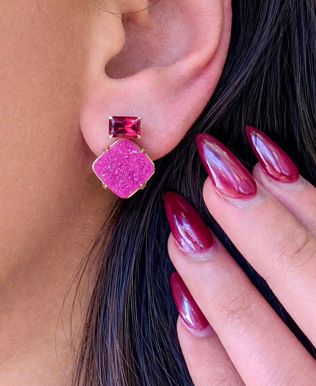14K yellow gold earrings with post backing and rhodolite garnets (1.25 cts) and cobalto calcite druzy