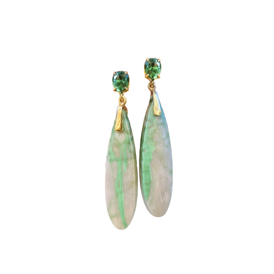 Handcrafted in 14K yellow gold, these post-style earrings feature a 1 carat pair of lagoon mint tourmalines paired with an elongated variscite drop. The natural green veins in the matrix of the variscite make each pair truly one-of-a-kind.