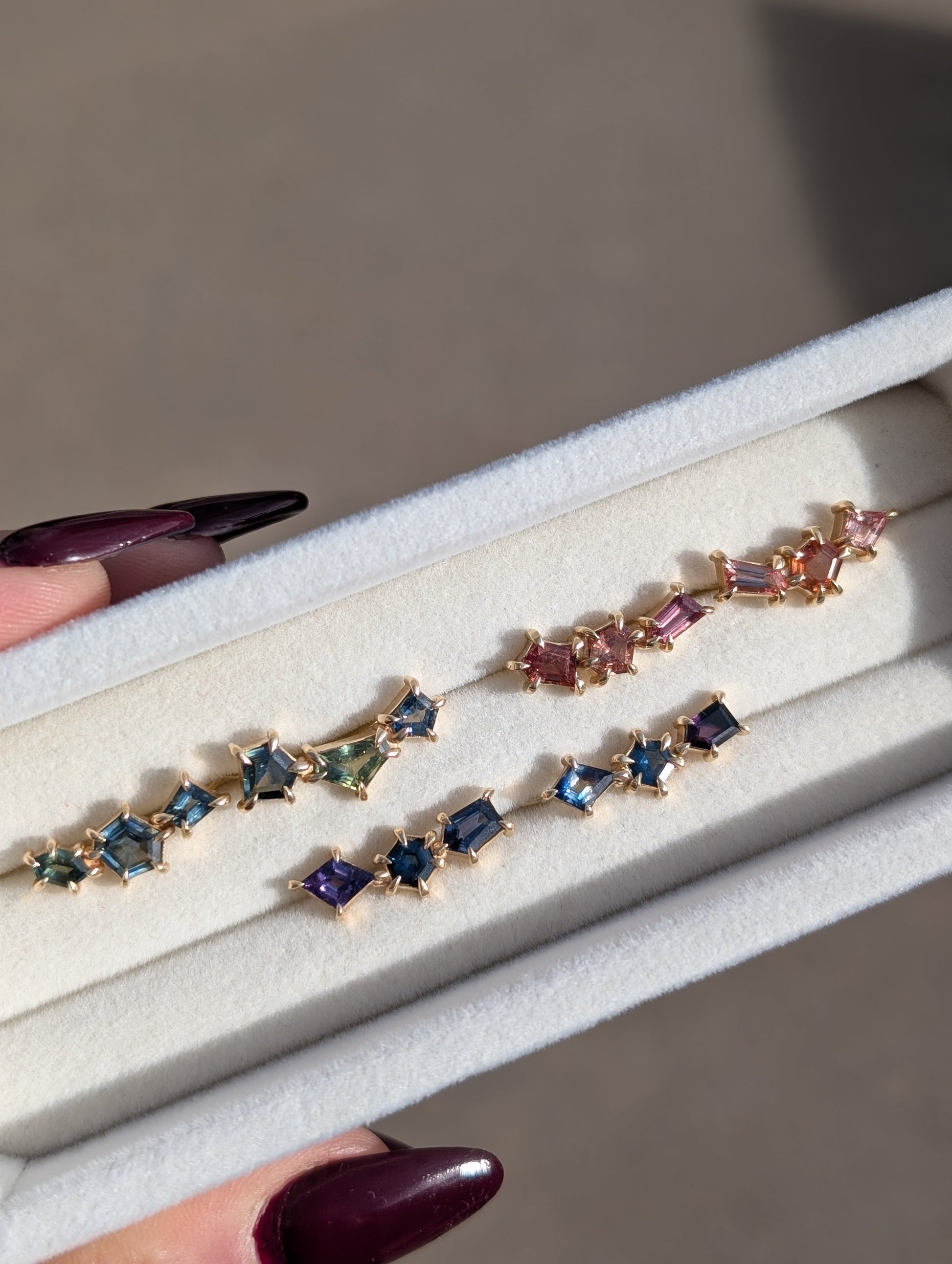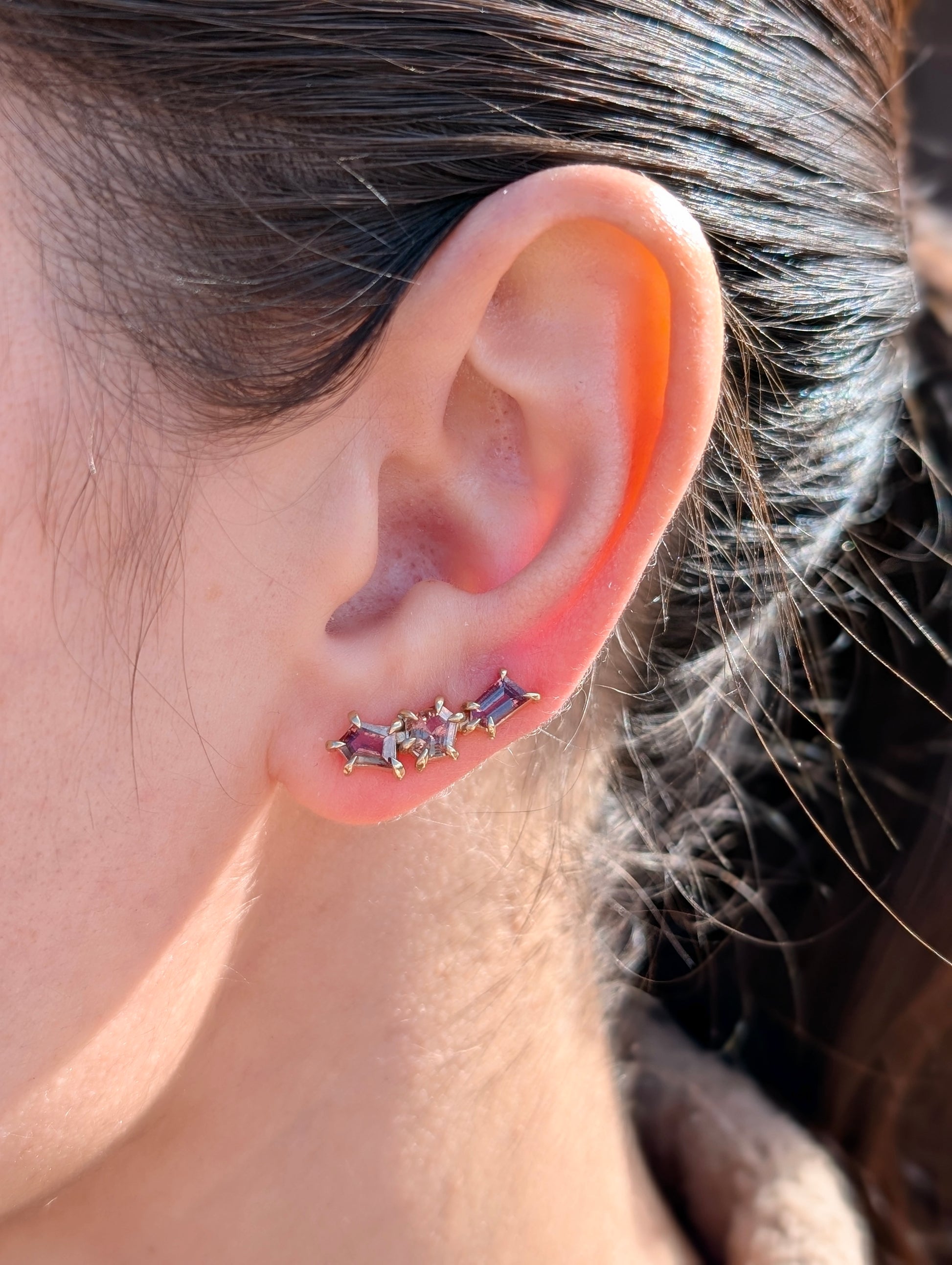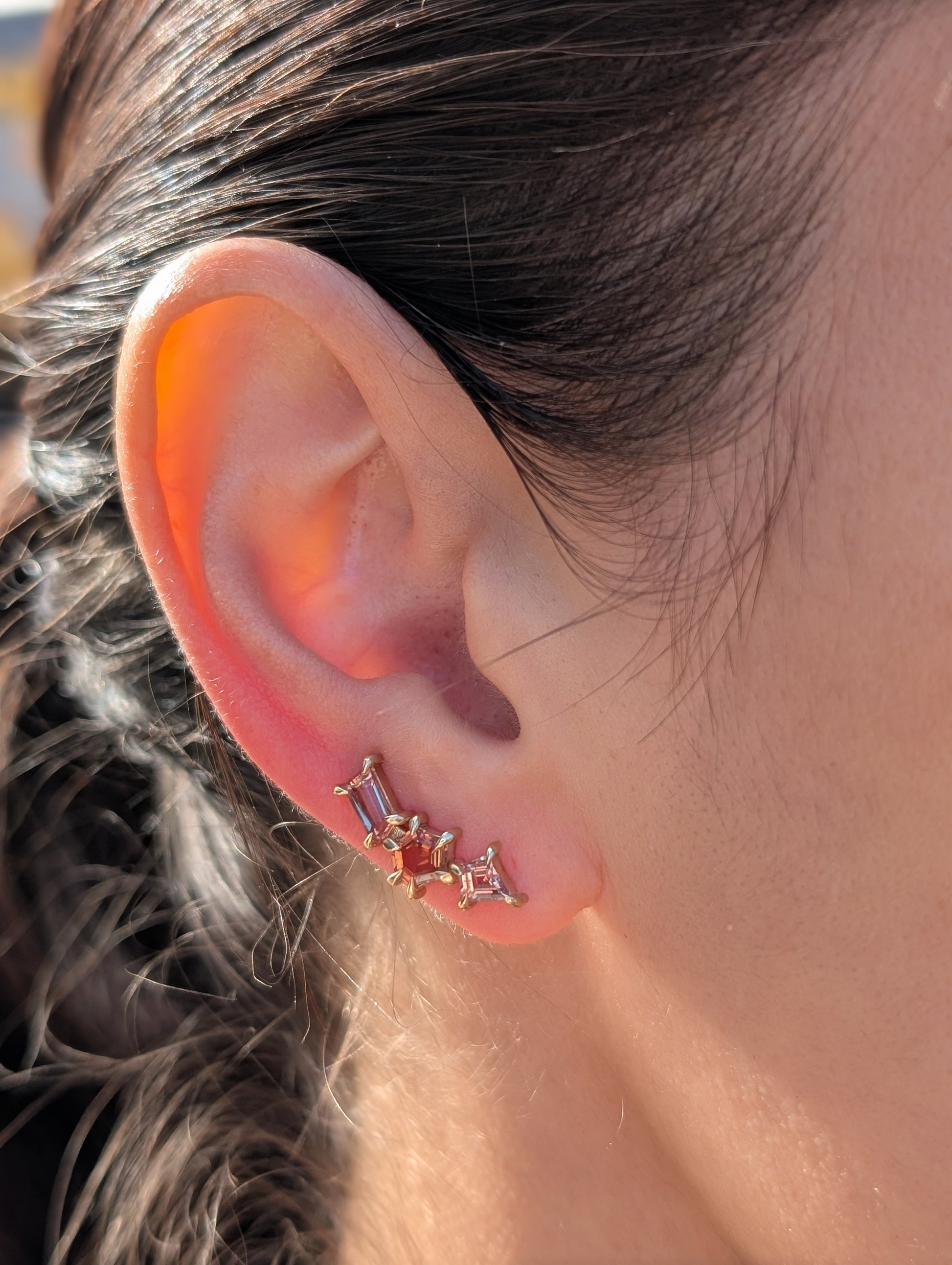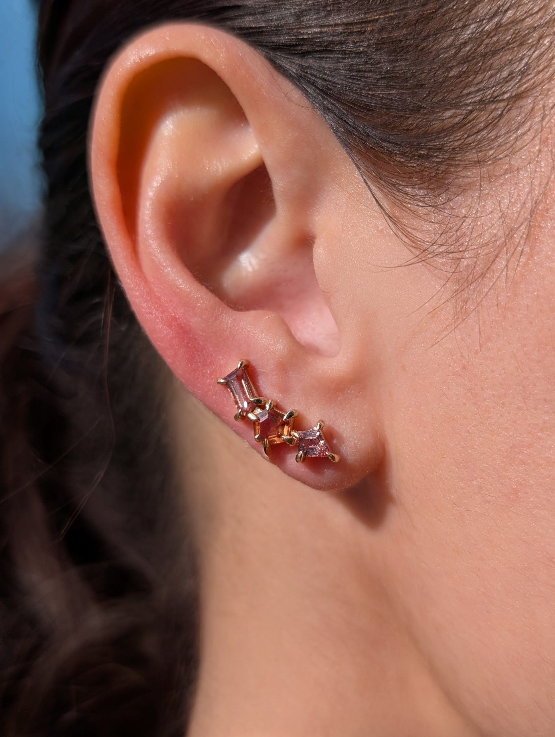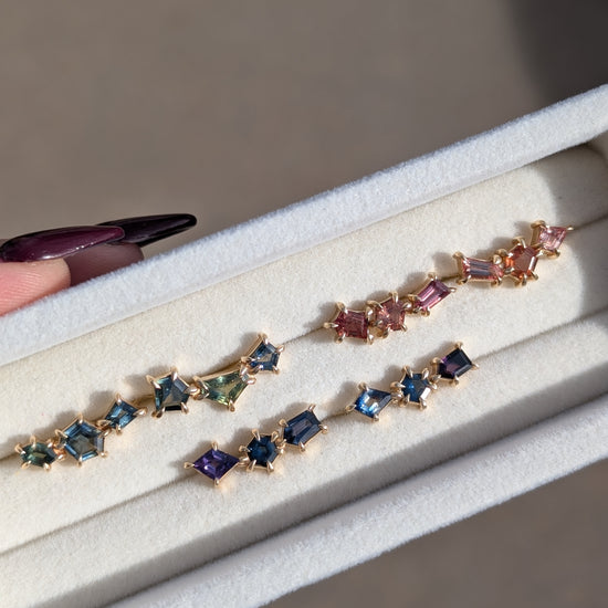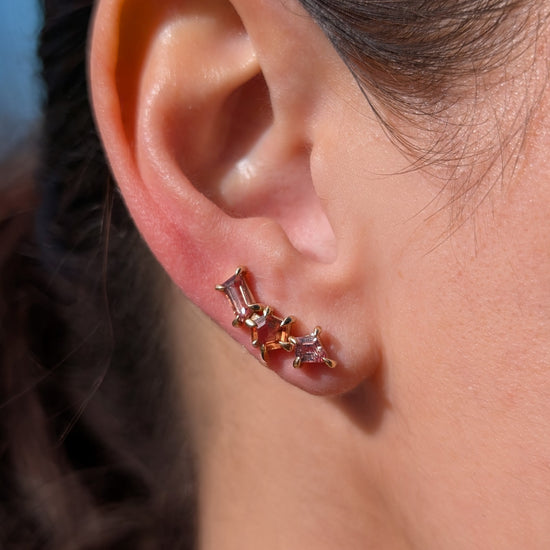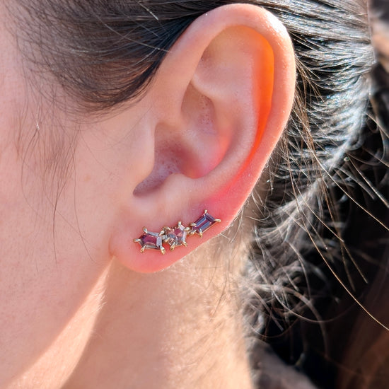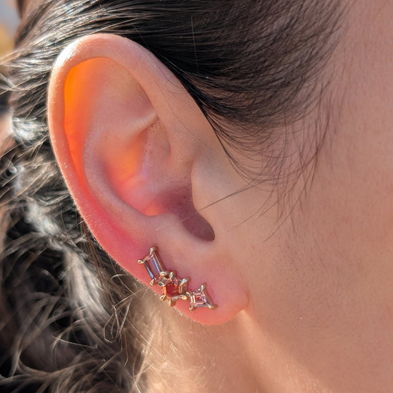 Sapphire geometric ear climbers designed to elegantly trace the natural curve of your ear. The ear climber design eliminates the need for multiple piercings while providing secure, comfortable wear throughout the day.