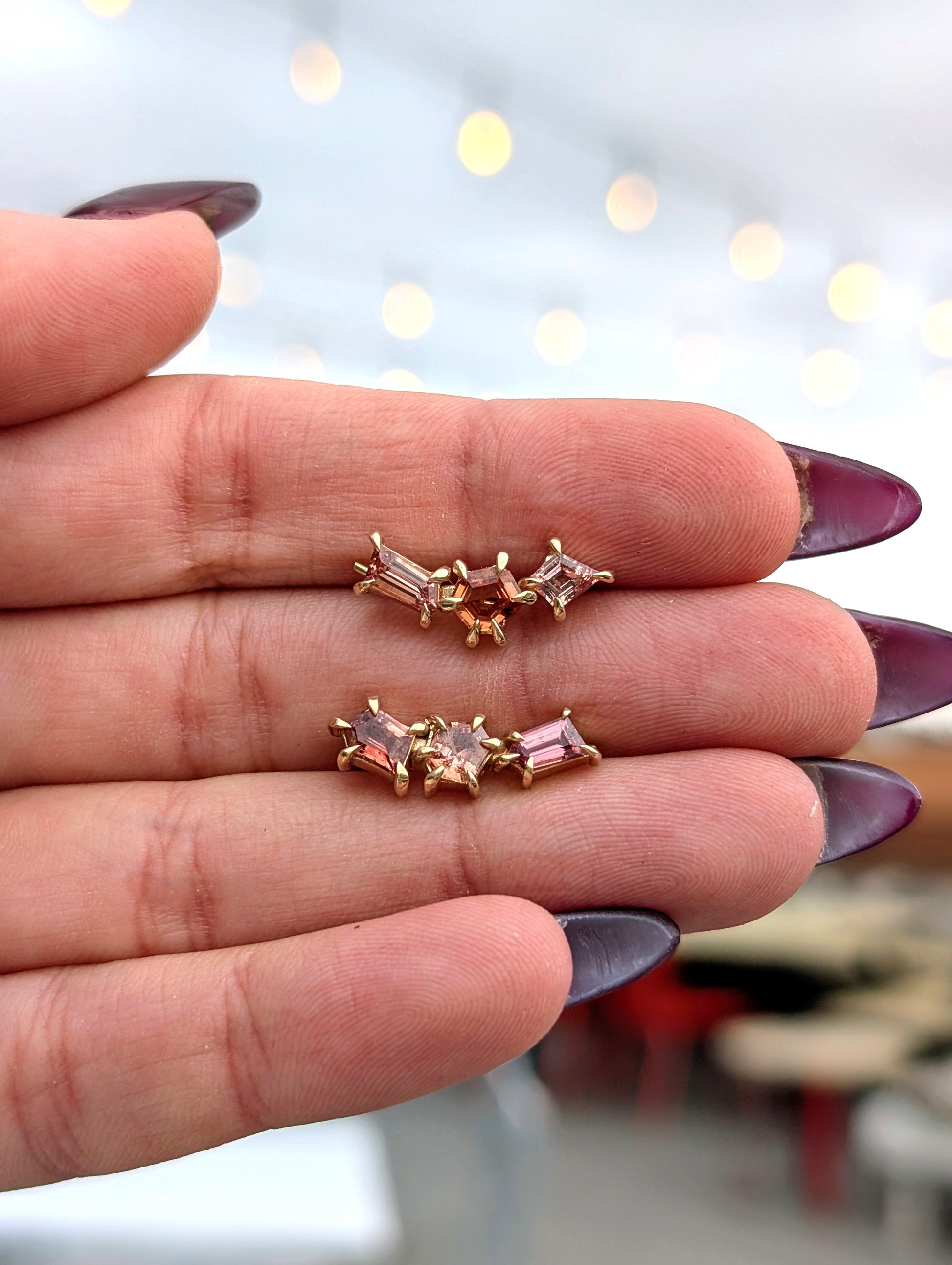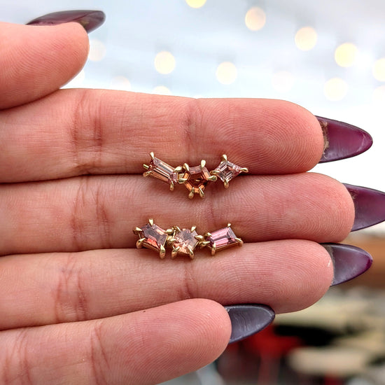14K yellow gold sapphire ear climber pair (left and right) in a mix of geometric cuts in various shades of peach.