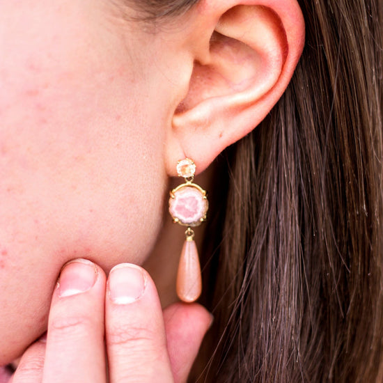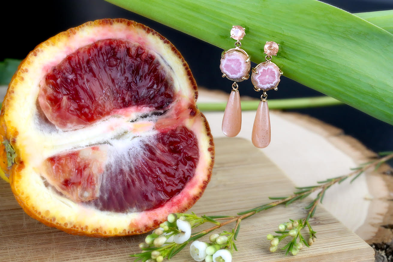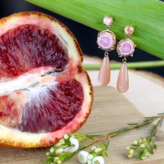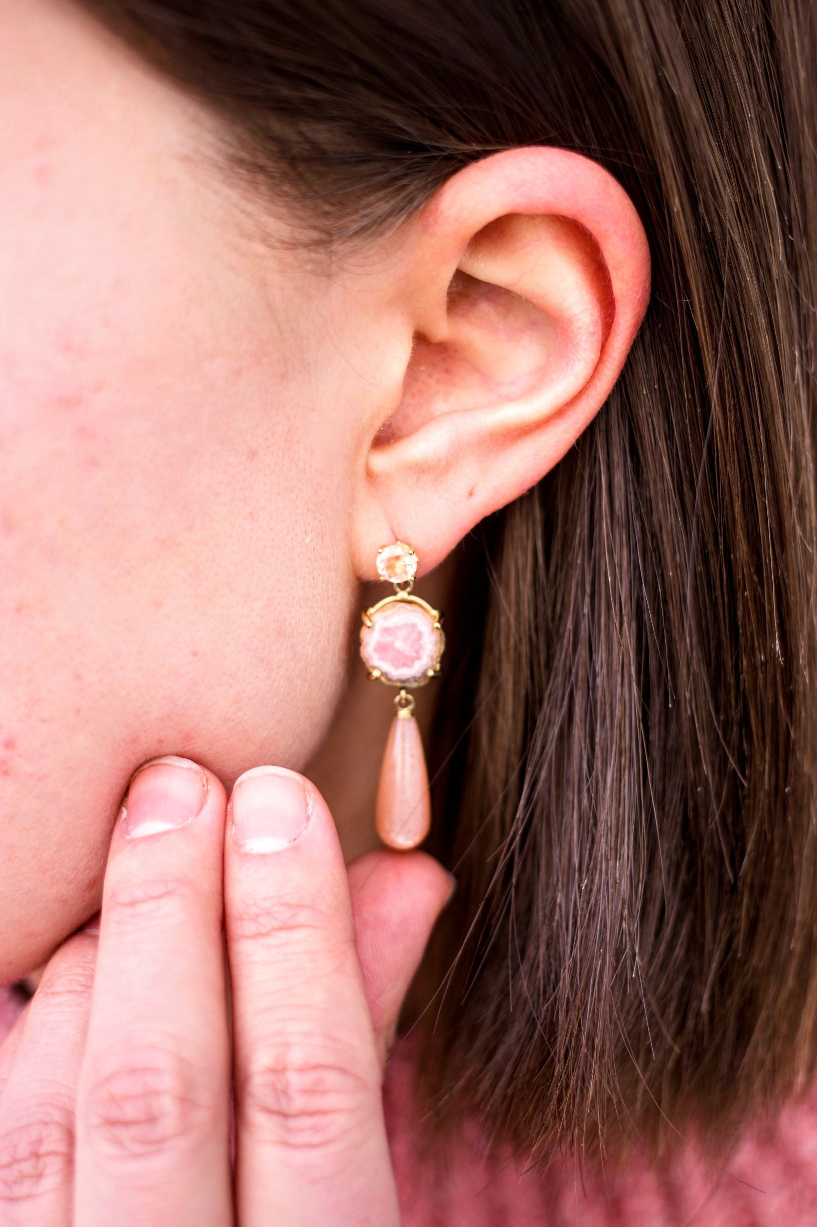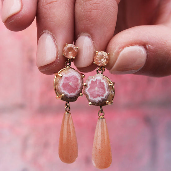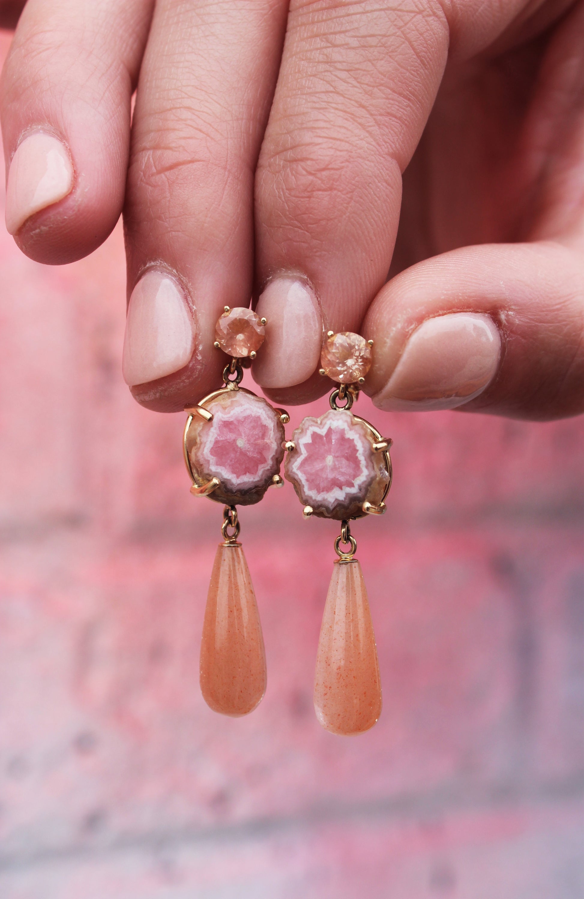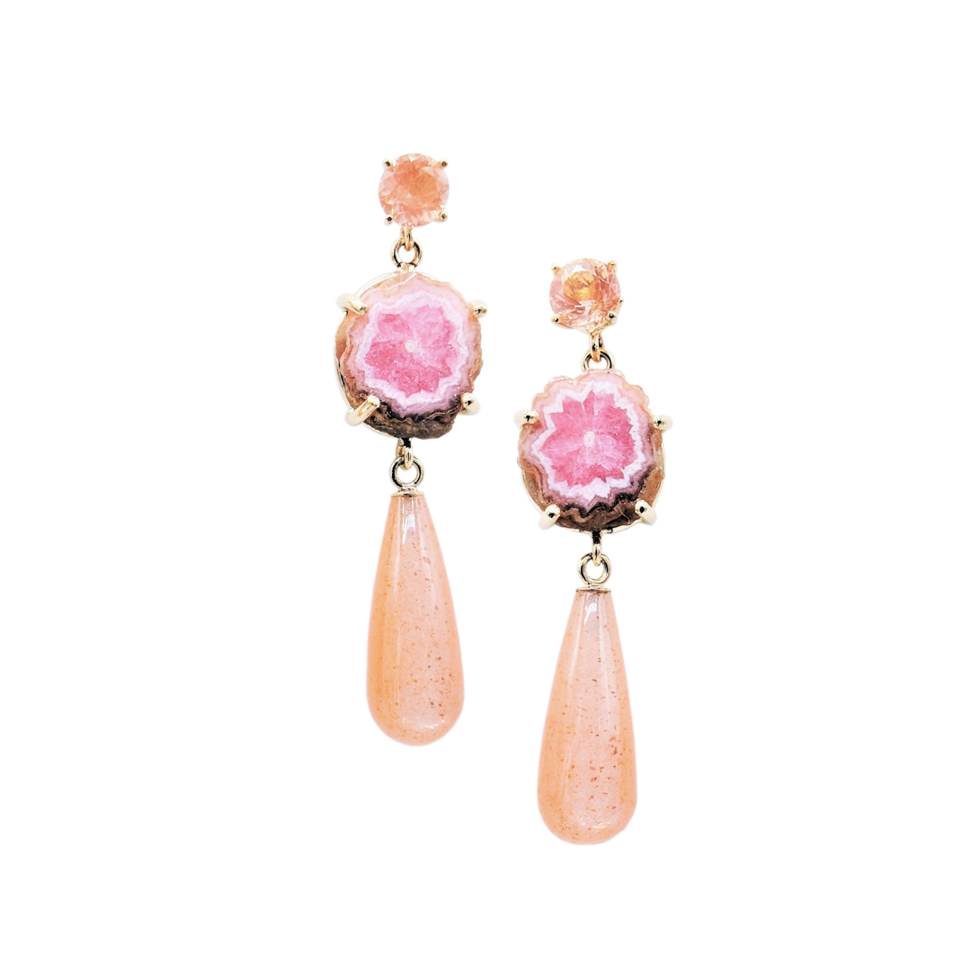 One-of-a-kind gemstone drop earring with sunstone, rhodochrosite slices and peach moonstone briolette drops