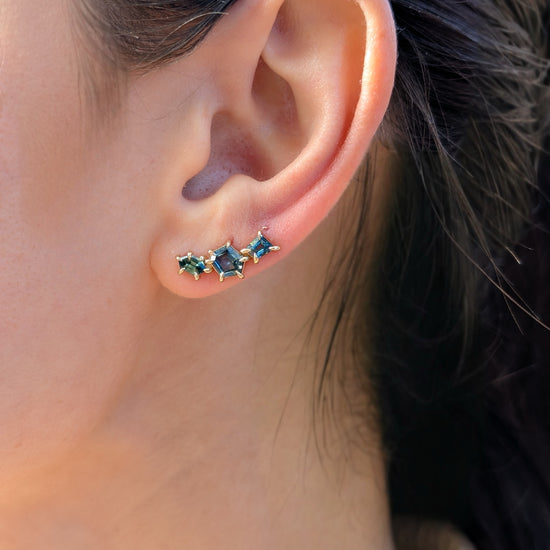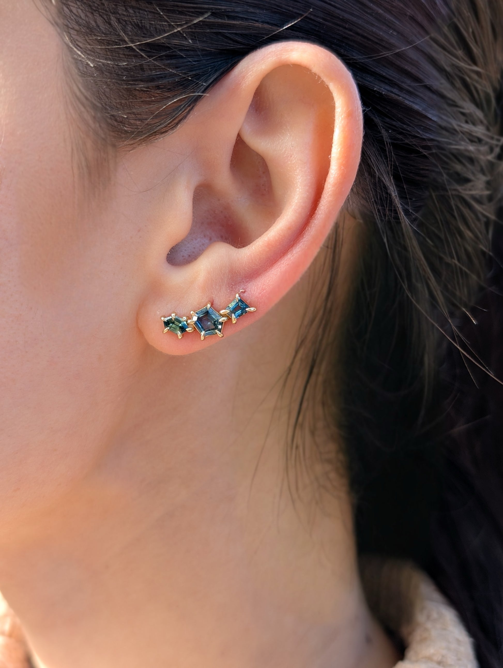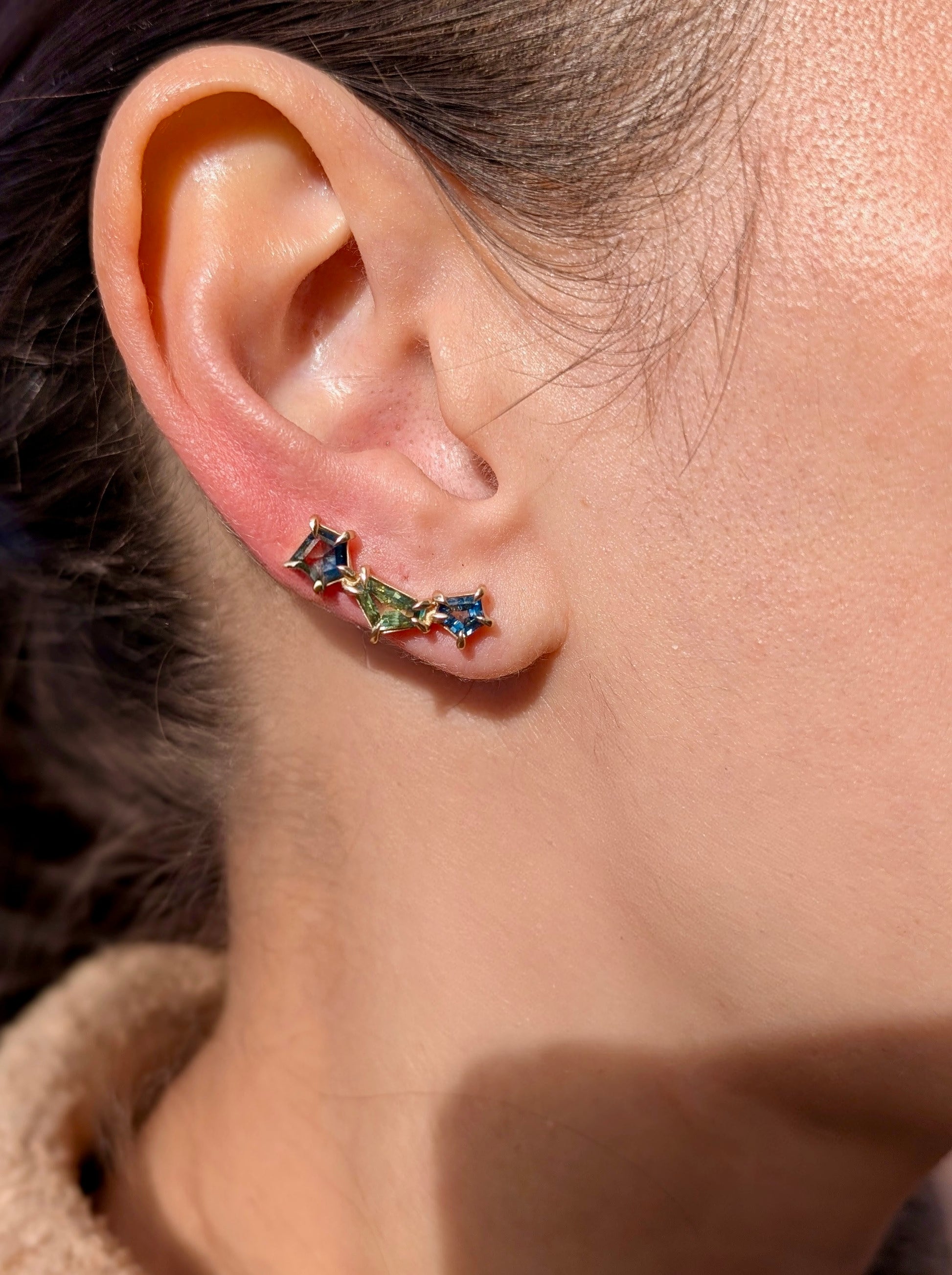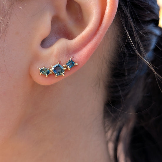 Sapphire geometric ear climbers designed to elegantly trace the natural curve of your ear. The ear climber design eliminates the need for multiple piercings while providing secure, comfortable wear throughout the day.