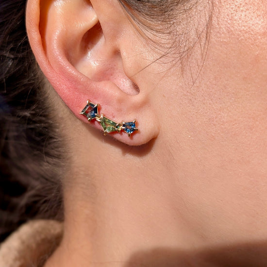 14K yellow gold sapphire ear climber pair (left and right) in a mix of geometric cuts in various shades of blue and green.