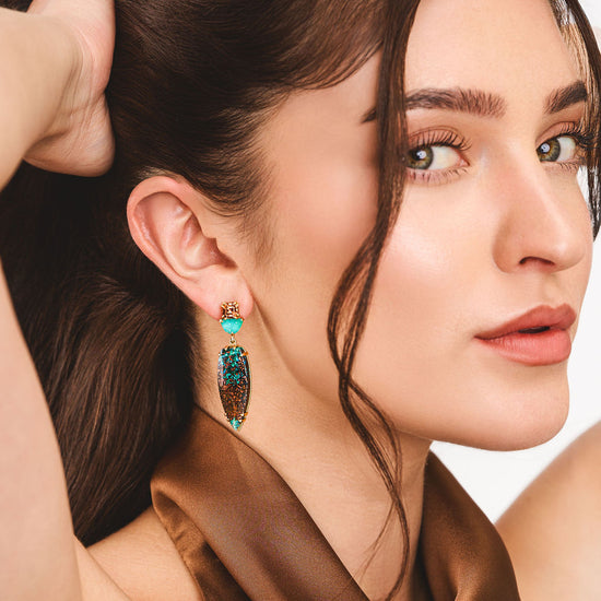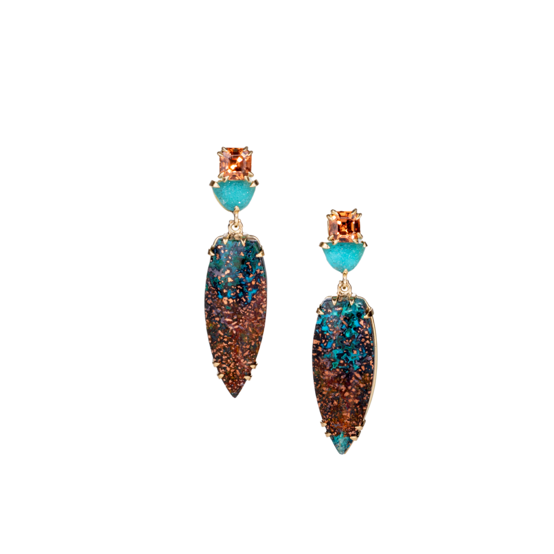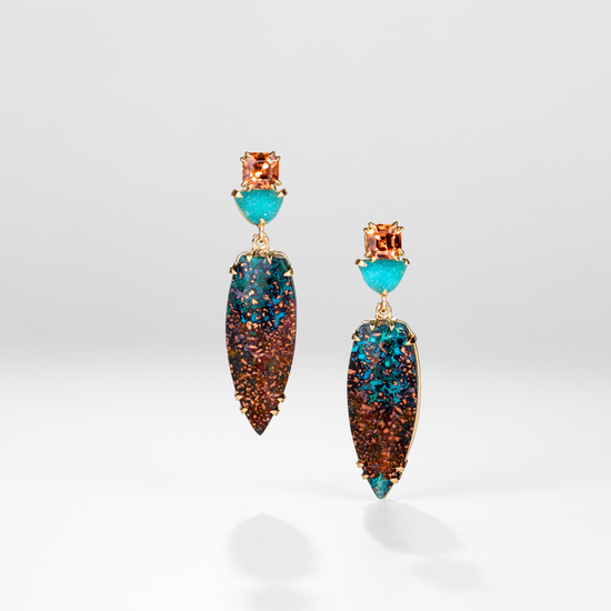 Named after the mythical mermaid, the Siren Earrings are both mysterious and alluring. The center-piece gemstone is a striking pair of chrysocolla, glistening with coppery flecks against a vivid teal backdrop. Above them, half-moon chrysocolla druzy cabochons, crowned with radiant orange zircons like the sun hitting the ocean's surface.