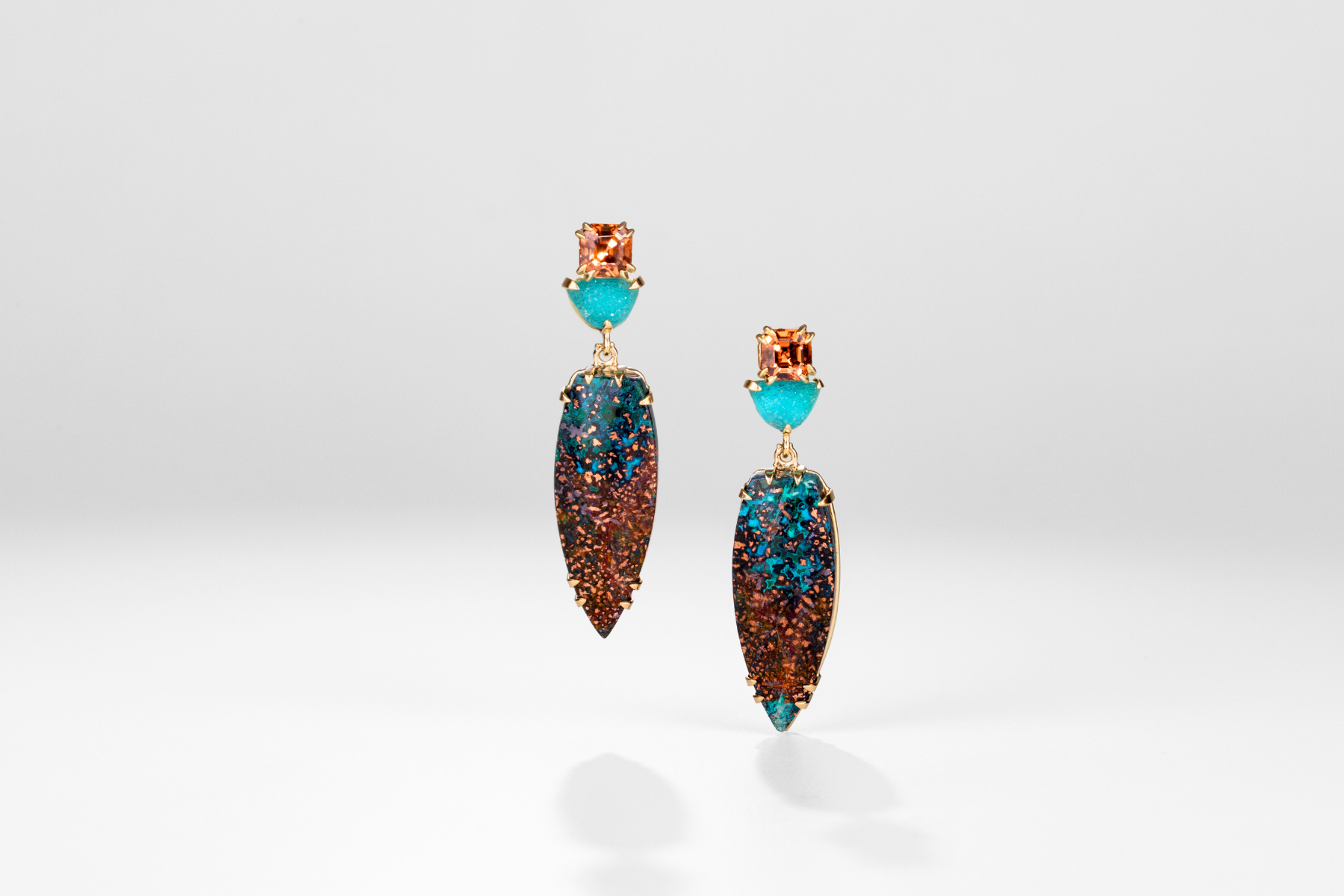14K yellow gold one-of-a-kind earrings with orange zircon (2.5 cts), druzy chrysocolla, and copper chrysocolla drops.