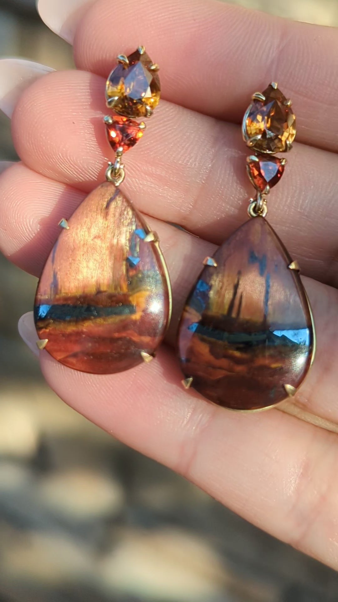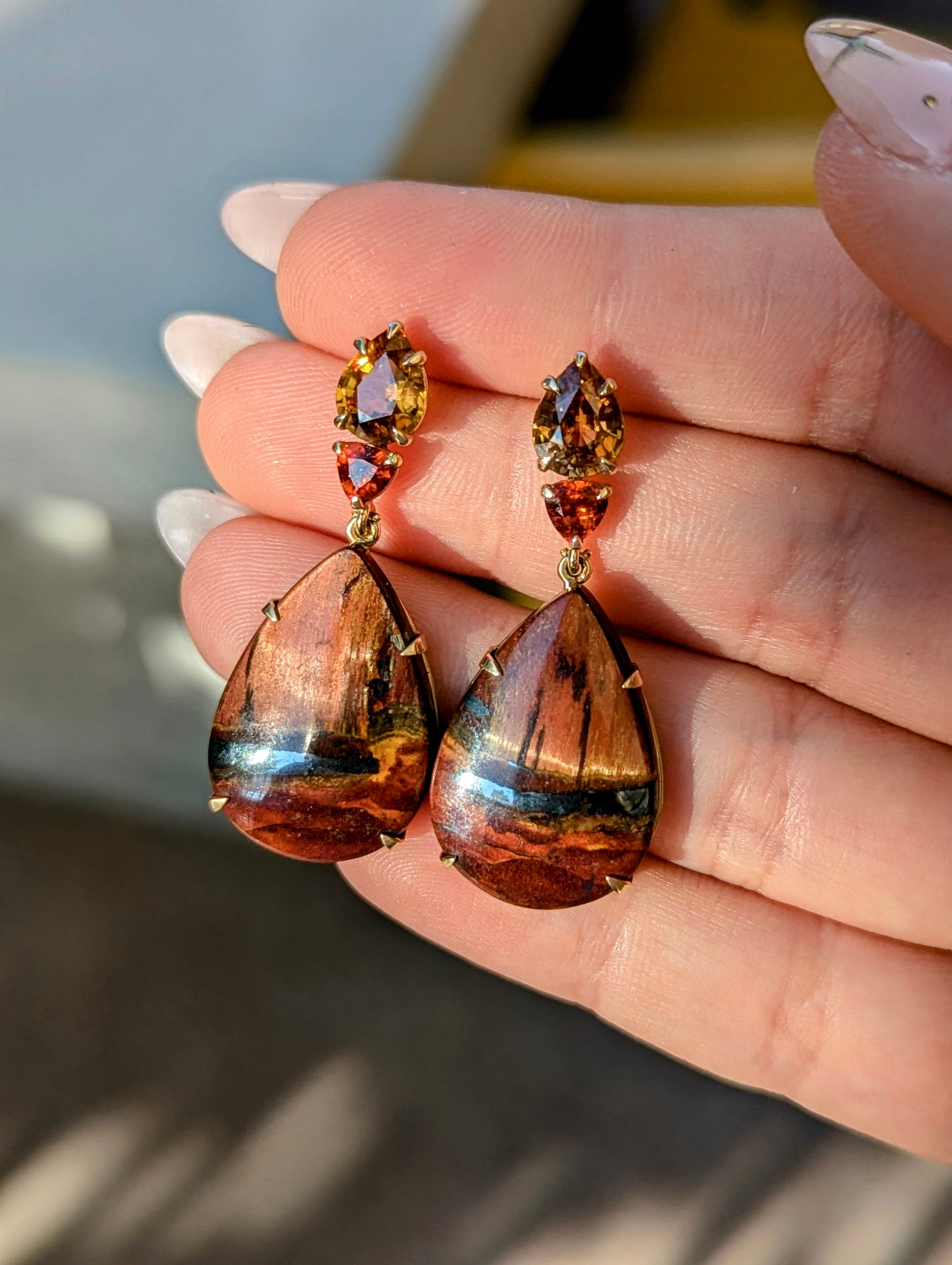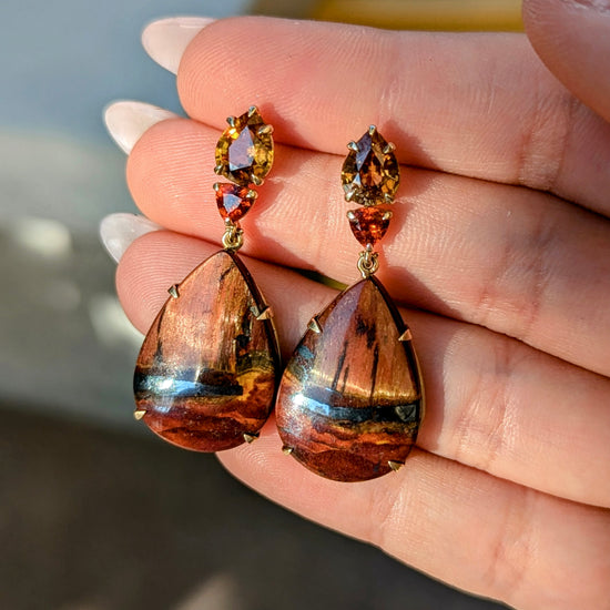 14K yellow gold one-of-a-kind earrings with zircon (3.74 cts), spessartine garnet, and Marra Mamba tiger's eye.