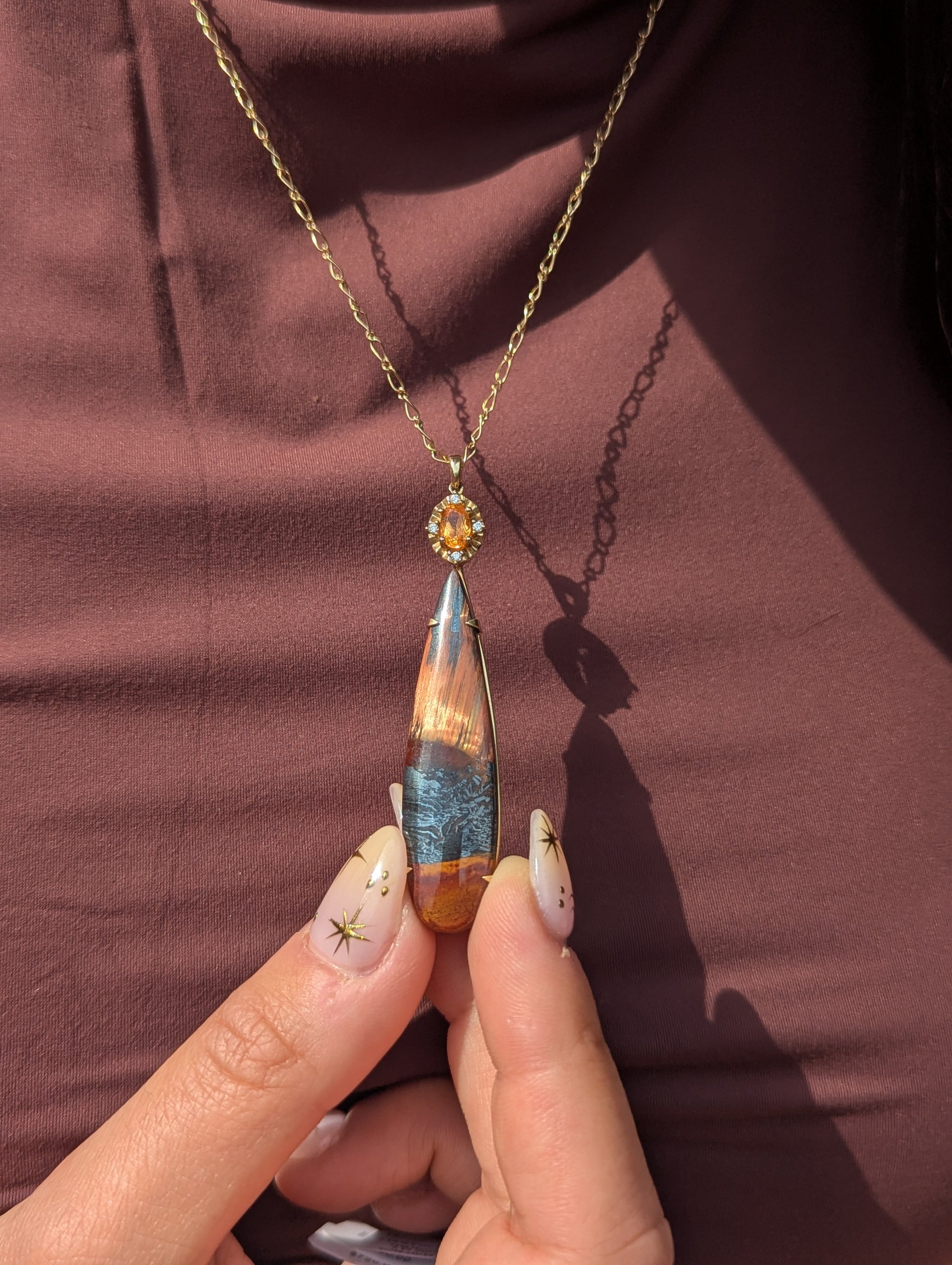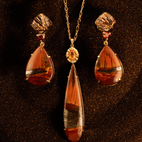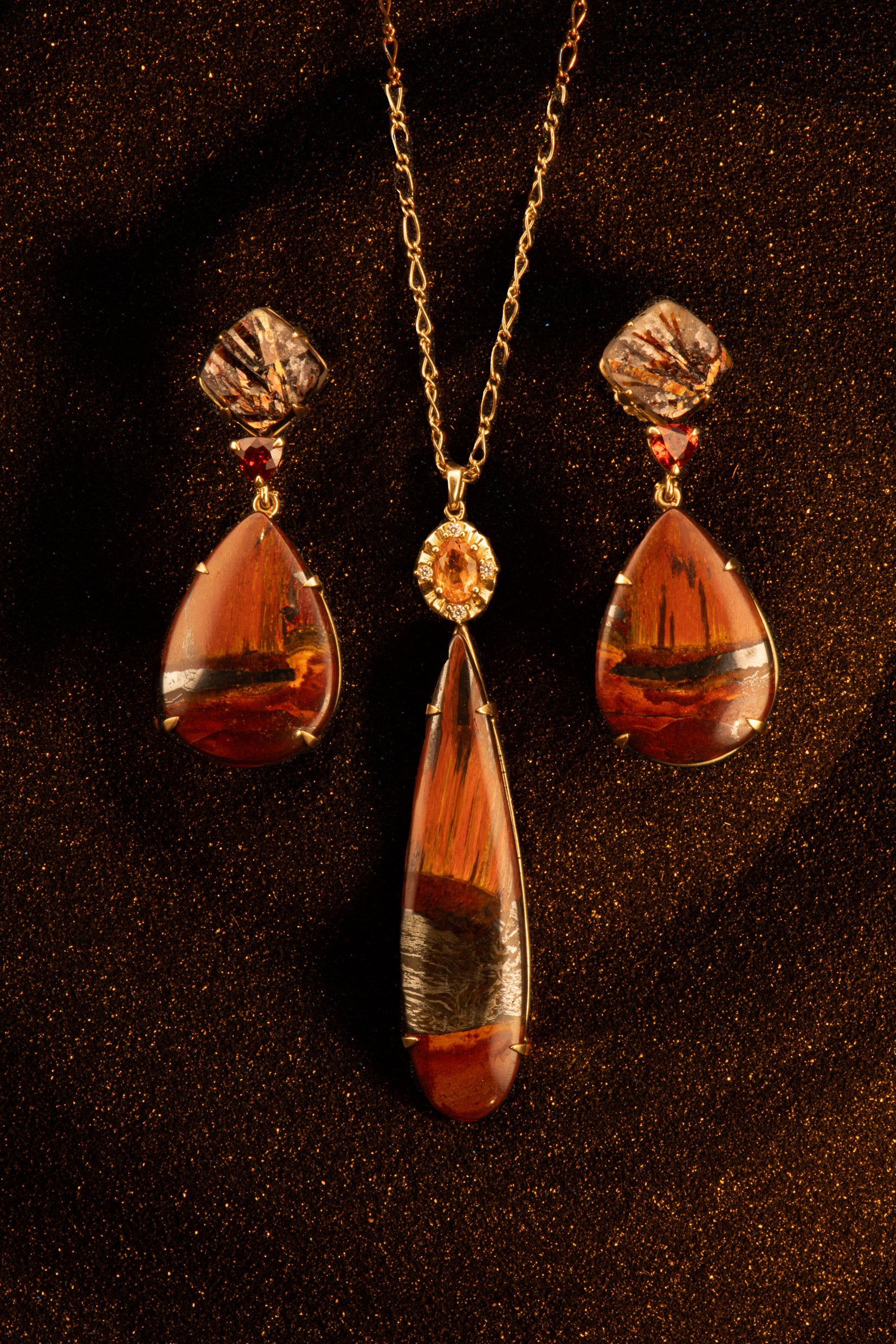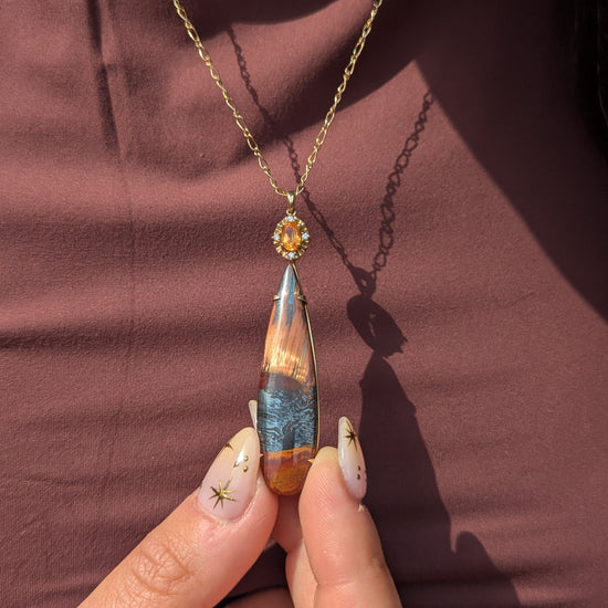 14K yellow gold one-of-a-kind necklace with diamonds (.05 cts), mandarin garnet, and Marra Mamba tiger's eye on an 18" figaro chain.