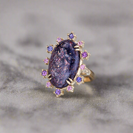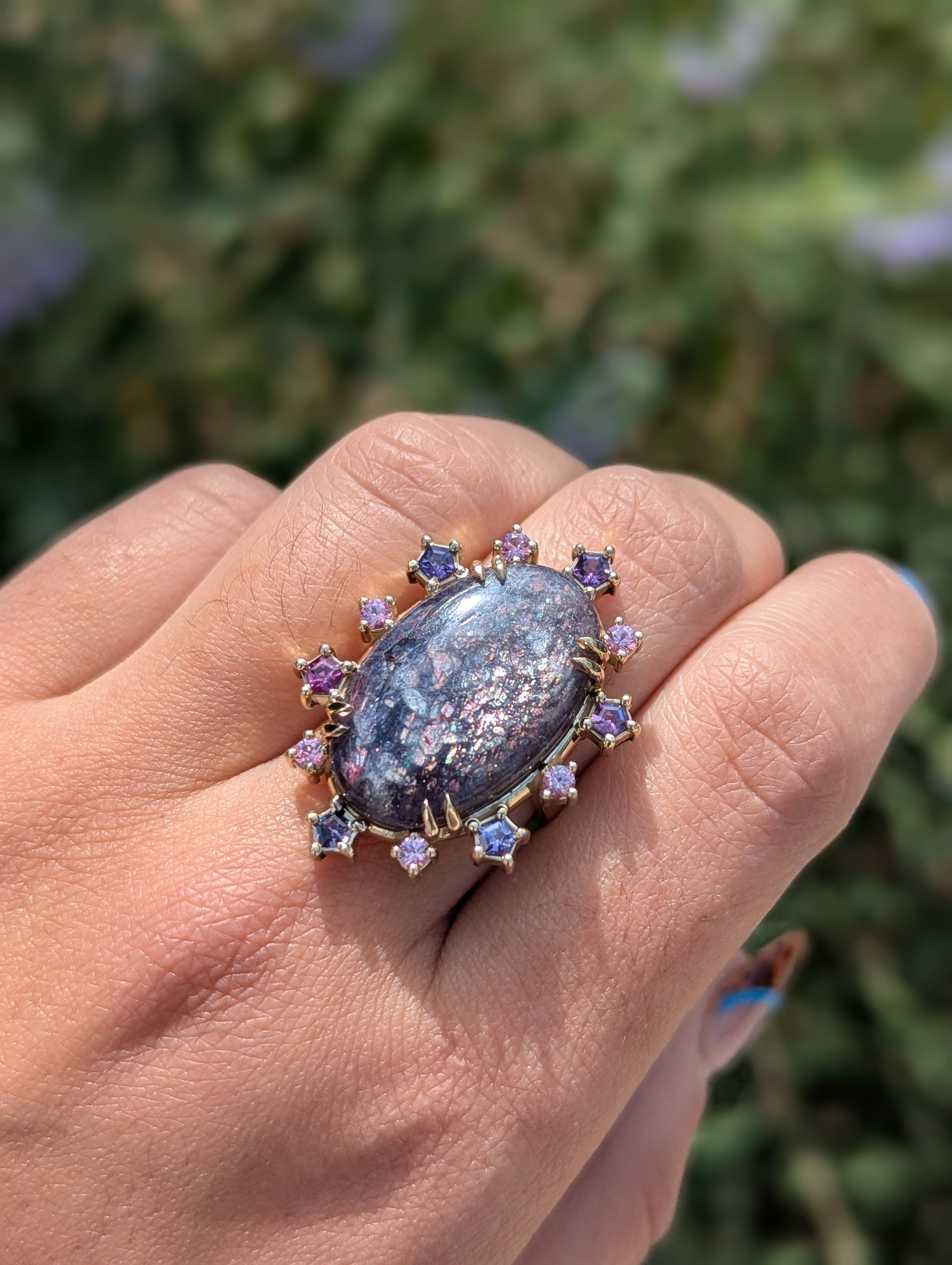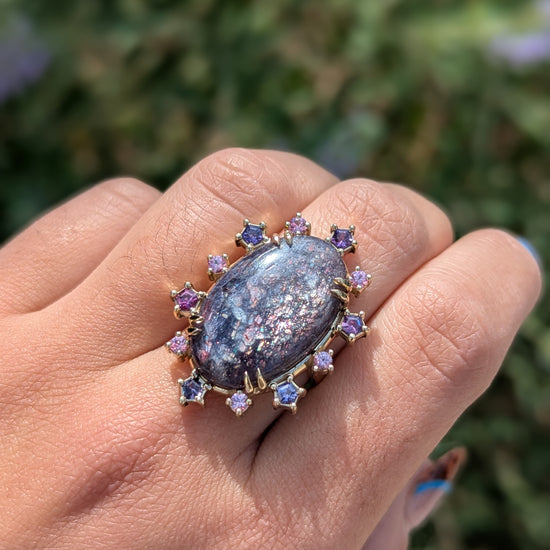 The iolite sunstone, with its cosmic shimmer and galaxy-like inclusions, is surrounded by a constellation of sapphires, capturing the beauty of starlight against a night sky.