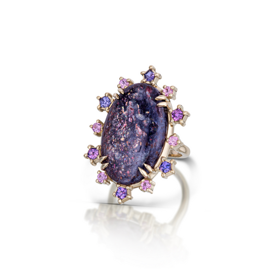 This piece features an Iolite Sunstone from Tanzania, an uncommon and natural formation of the minerals iolite and sunstone. Within the violet toned iolite, there are tiny hematite platelets creating a shimmering effect as light moves across the stone.