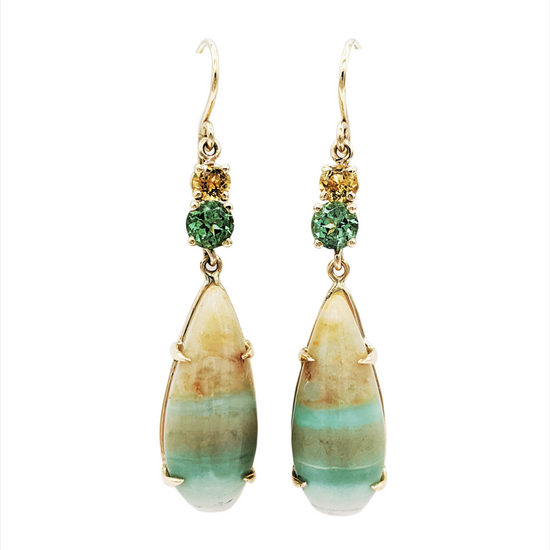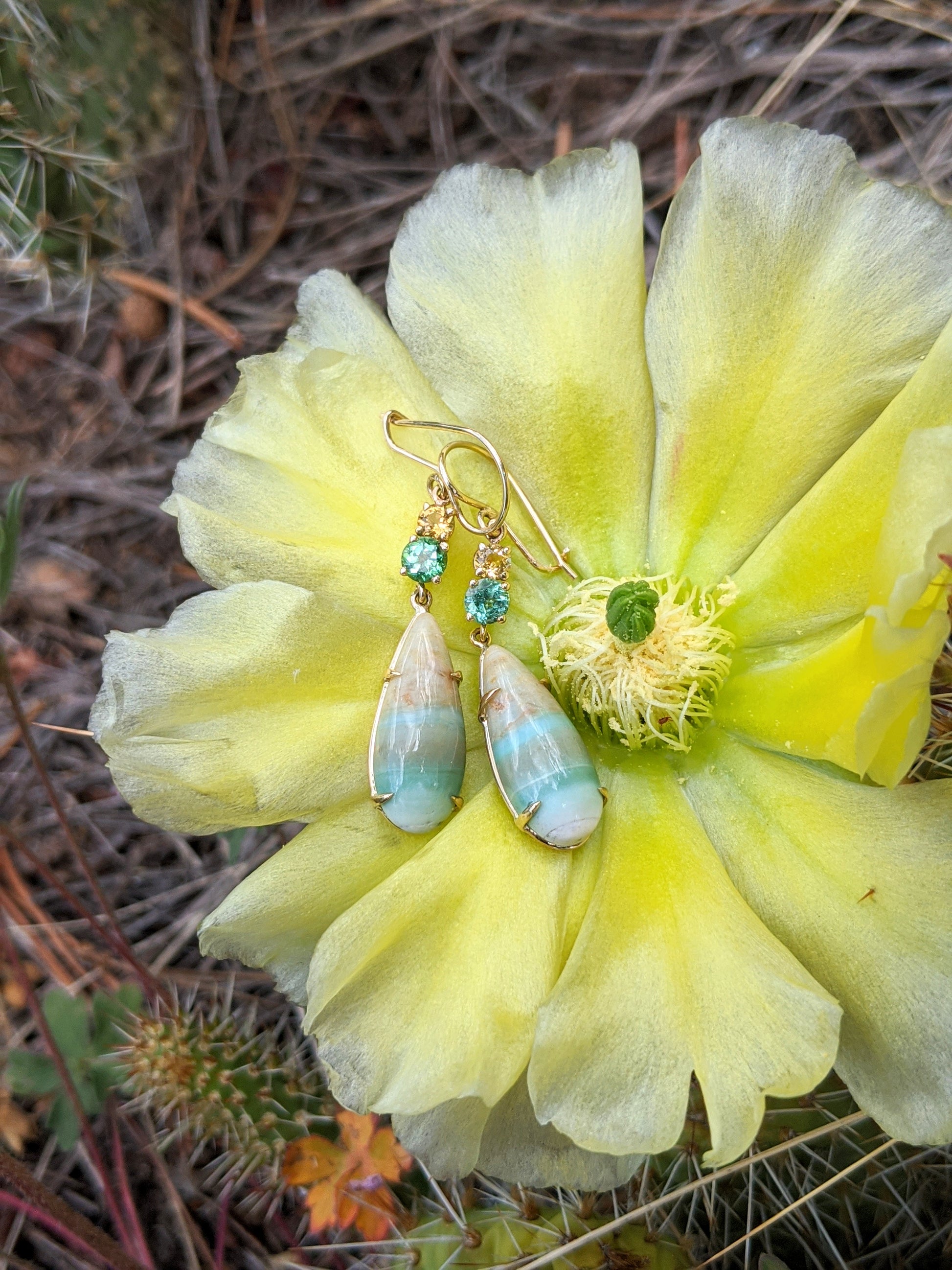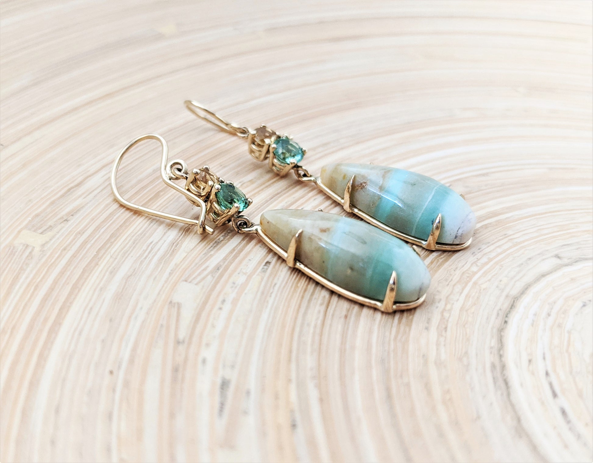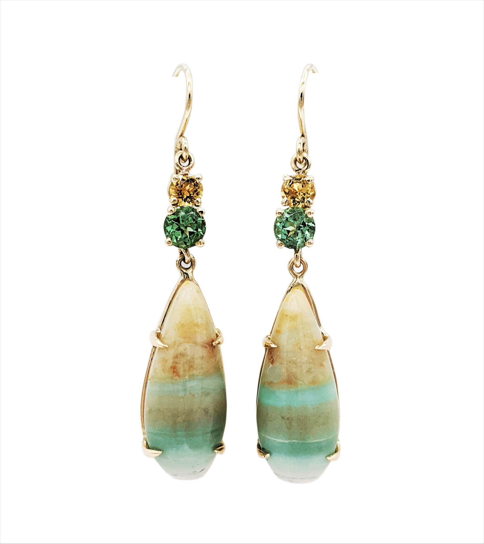 All of the gemstones used in this piece are untreated and are of natural color. Wrapped in 14K yellow gold, the opalized wood is held with a hand-fabricated custom-fit backing, ensuring a perfect fit and added security.