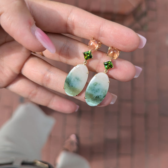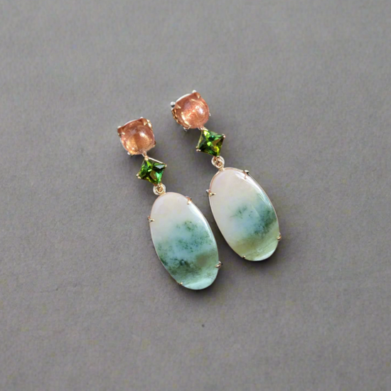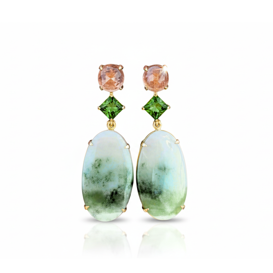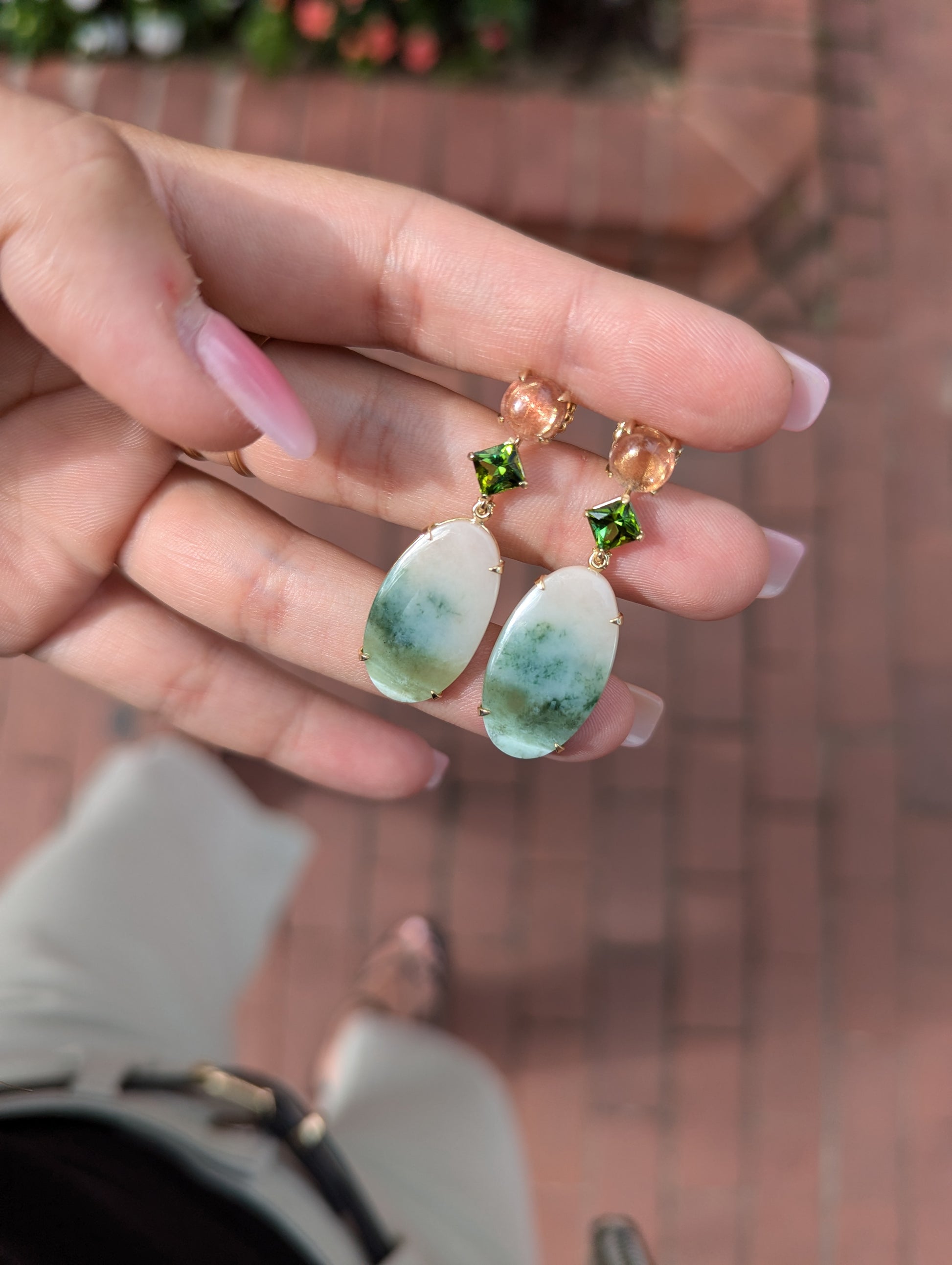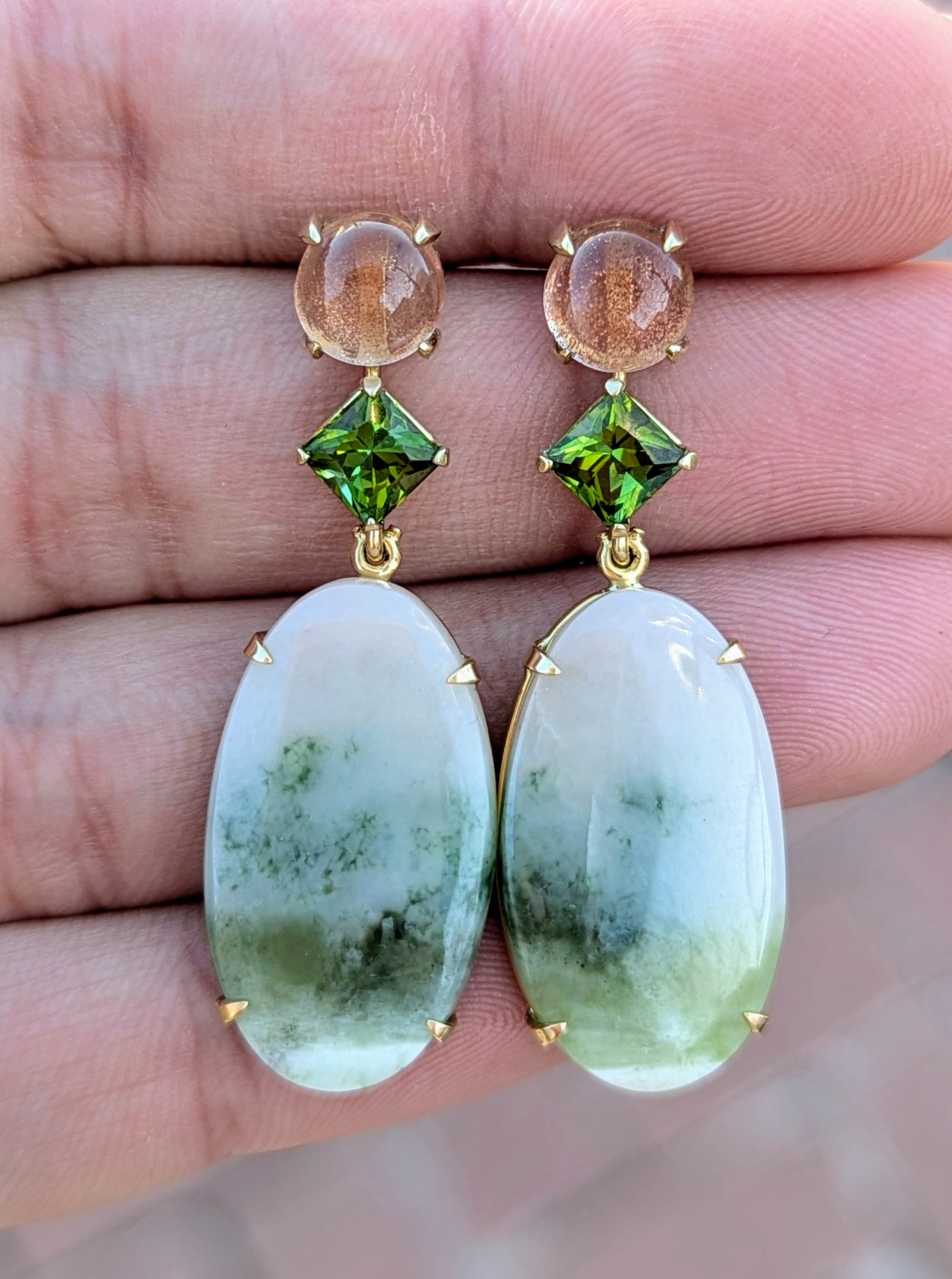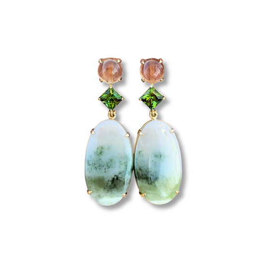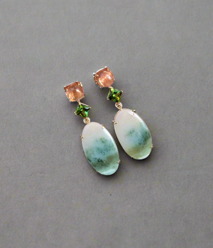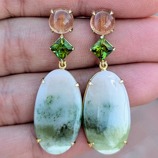 Hand-crafted from 14K yellow gold, these one-of-a-kind earrings feature a unique combination of sunstone, green tourmaline, and hydrogrossular garnet. Hydrogrossular garnet is a semi-precious gemstone that's translucent to opaque and often in soft green/pink/white/grey tones. This rare type of garnet is sometimes referred to as "watermelon garnet" due to its shades of green and pink. The gemstone displays a rich landscape, evoking a whimsical, forest-like image.